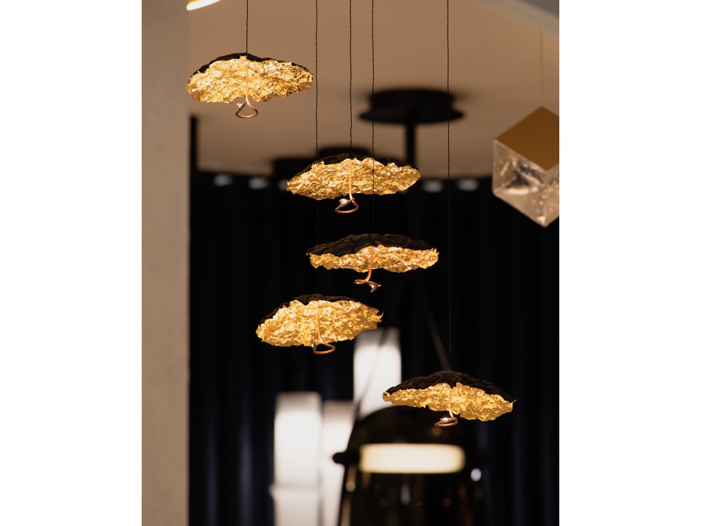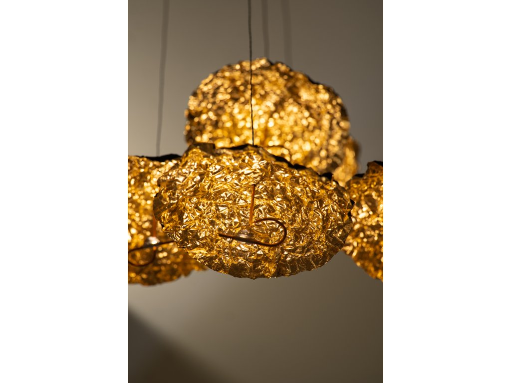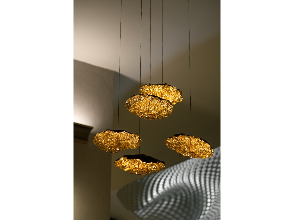 Gold Moon IC je závěsné svítidlo určené pro sádrokartonové stropy. Jemný kabel nese nepravidelný kotouč, ručně vyrobený a zevnitř pokrytý zlatou fólií. Tento třpytivý povrch odráží a zesiluje světlo, které vychází z LED diody uložené v měděné spirále. Průměr stínidla činí 20 cm. Maximální délka kabelu činí 175 cm. Svítidlo vdechne Vašemu prostoru eleganci a příjemnou atmosféru. Svítidlo skvěle doplní styl obývacího pokoje, jídelny či ložnice.