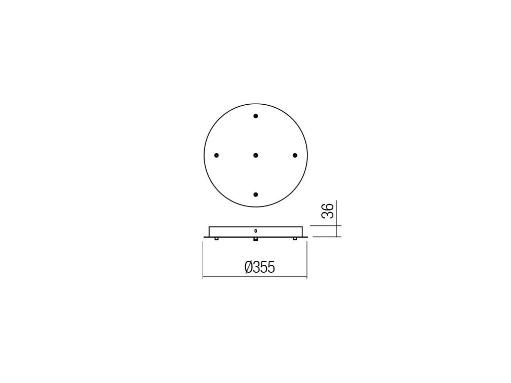 Okrúhly kovový podstavec, lakovaný matnou čiernou, bielou alebo chrómovou farbou, pre montáž 3 závesných svietidiel Maximálny priemer výstupného otvoru pre kábel 7 mm.
