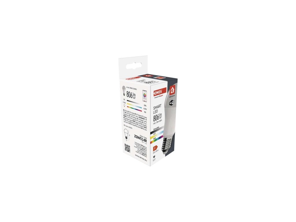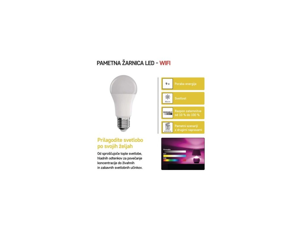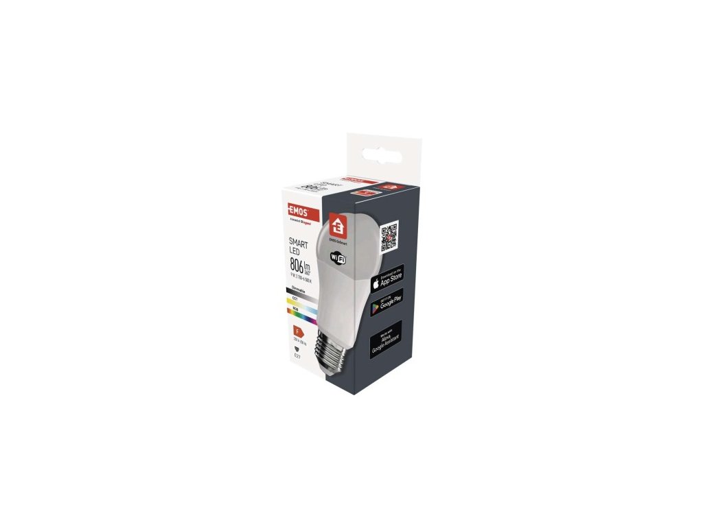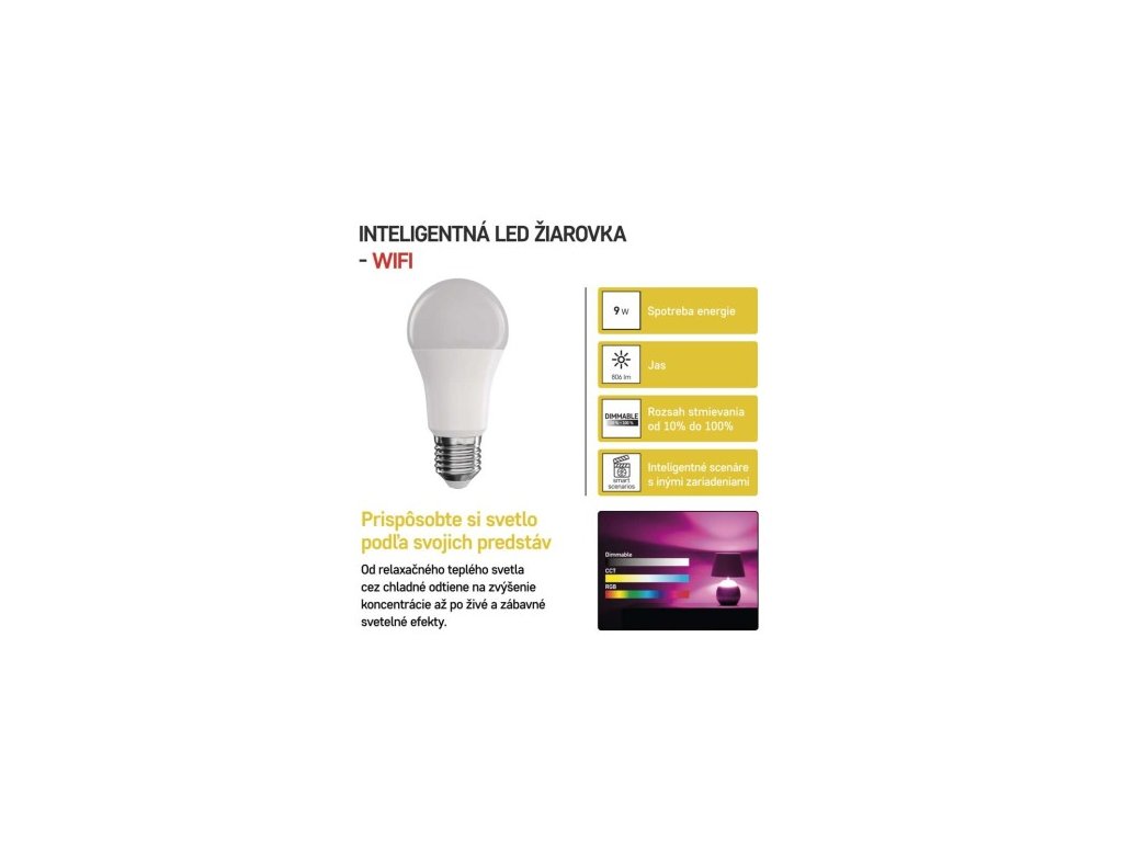 farba svetla: RGB|energetická trieda: F|index podania farieb (CRI): 80|kompatibilita: EMOS GoSmart, TUYA, LIDL, Smartlife|náhrada za žiarovku: 60 W|napätie: 230 V~/50 Hz|notifikácia do mobilnej aplikácie: áno|ovládanie hlasovými (uchytenie žiarovky): E27|počet čipov: neuvádza sa|počet spínacích cyklov: 15 000|podporované OS: Android, iOS|prenosová frekvencia: 2,4 GHz WIFI|príkon: 9 W|predajný obal: 1 ks, krabička|protokol: Wi-Fi| 120 mm|stmievateľná: áno|svetelná účinnosť: 90 lm/W|svetelný tok: 806 lm|technológia: LED|teplota chromatickosti: 2 700–6 500 K|tvar: A60|typ čipov: SMD|účiník: 0,0 doba: 2 roky|životnosť: 20 000 hodínDodatočné parametre