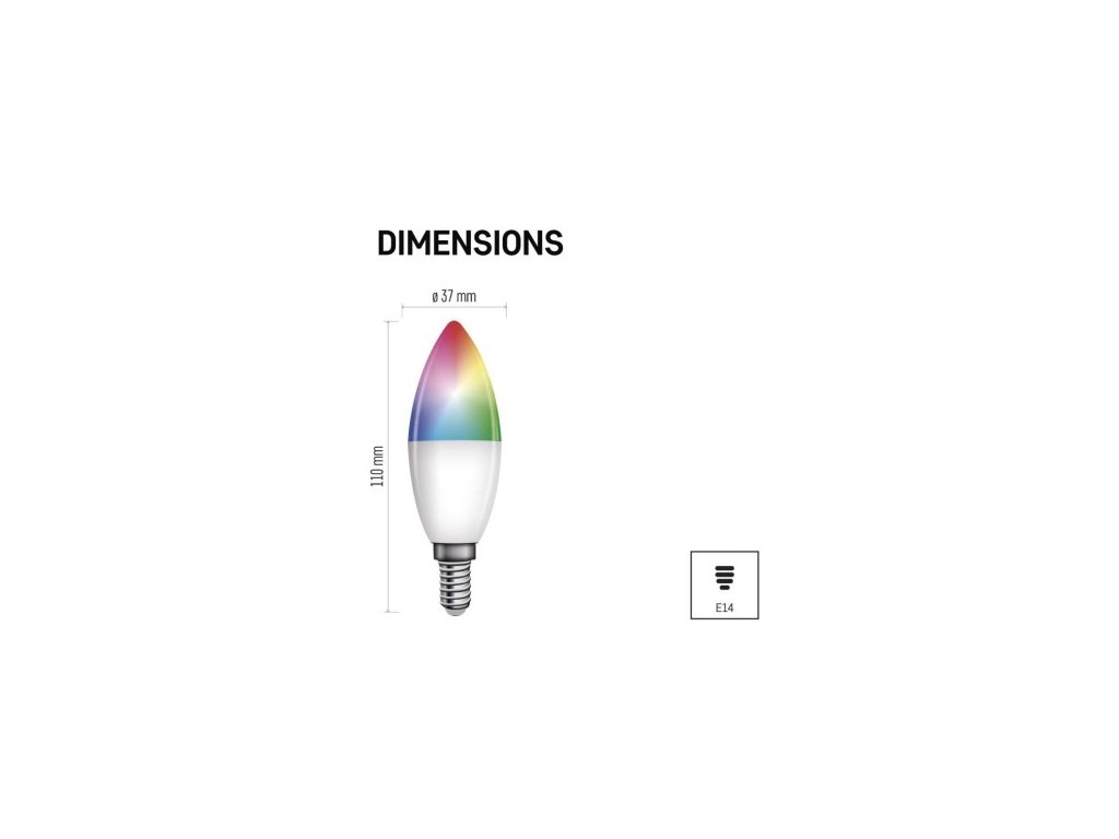 farba svetla: RGB|energetická trieda: F|index podania farieb (CRI): 80|kompatibilita: EMOS GoSmart, TUYA, LIDL, Smartlife|náhrada za žiarovku: 40 W|napätie: 230 V~/50 Hz|notifikácia do mobilnej aplikácie: áno|ovládanie hlasovými asistentmi (uchytenie žiarovky): E14|počet čipov: neuvádza sa|počet spínacích cyklov: 15 000|podporované OS: Android, iOS|prenosová frekvencia: ZigBee 2,4 GHz|príkon: 4,8 W|predajný obal: 1 ks, krabička|proto: 37 × 37 × 110 mm|stmievateľná: áno|svetelná účinnosť: 98 lm/W|svetelný tok: 470 lm|technológia: LED|teplota chromatickosti: 2 700–6 500 K|tvar: sviečka|typ čipov: SMD|úč| 180°|záručná doba: 2 roky|životnosť: 20 000 hodínDodatočné parametre