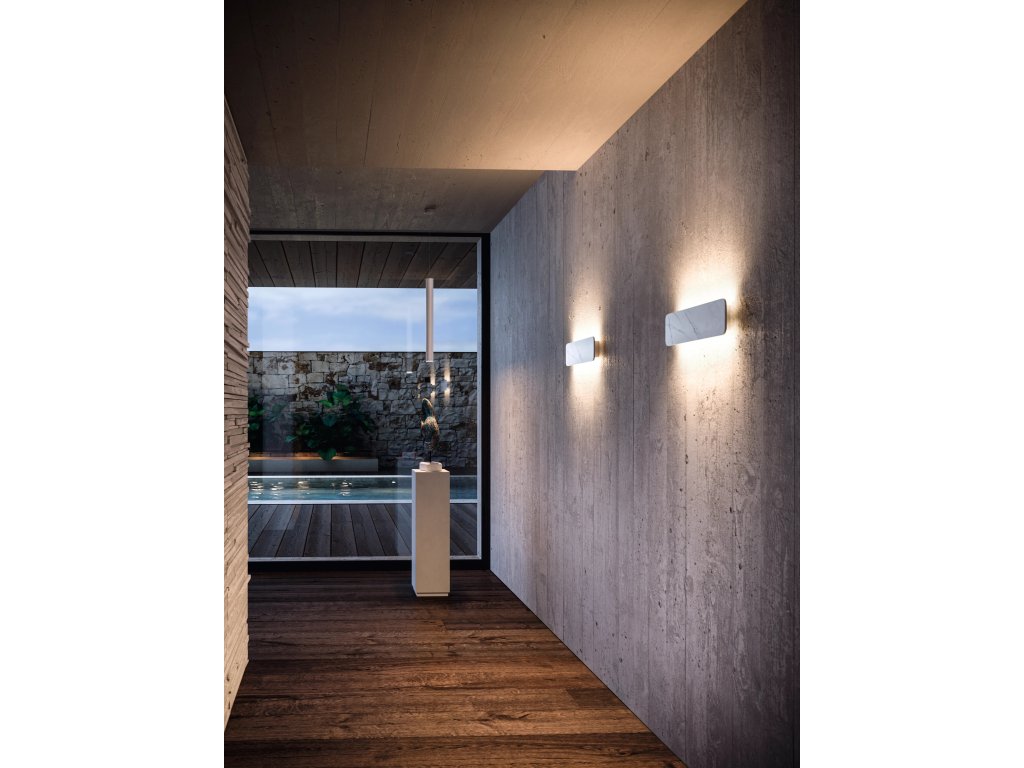 Sortiment je bohatý a rozmanitý, na zeď si můžete vybrat lineární nástěnné svítidlo s dvojím vyzařováním, ve dvou délkách – 26 nebo 39 cm – nebo kulaté nástěnné svítidlo o průměru 26 cm se speciálním šikmým tvarem, který umožňuje nasměrovat světlo nahoru. Mnoho návrhů, vždy ve třech ušlechtilých povrchových úpravách.