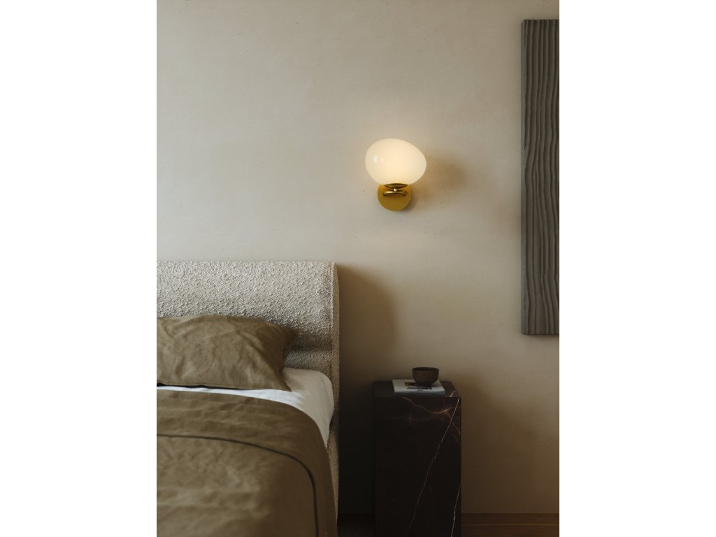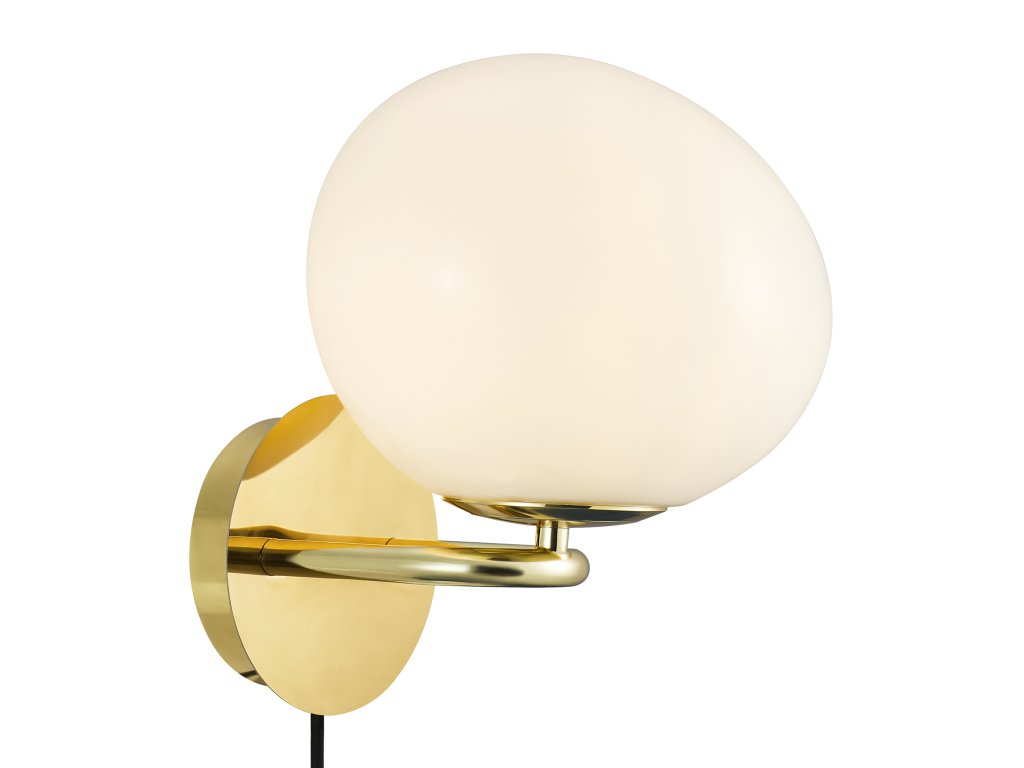 Nástenná lampička Shapes od Nordluxu s tienidlom z opálového skla v kombinácii s mosadznou základňou. Tienidlo v asymetrickej forme dodáva do priestoru mäkké rozptýlené žiarenie.Dodatočné parametre