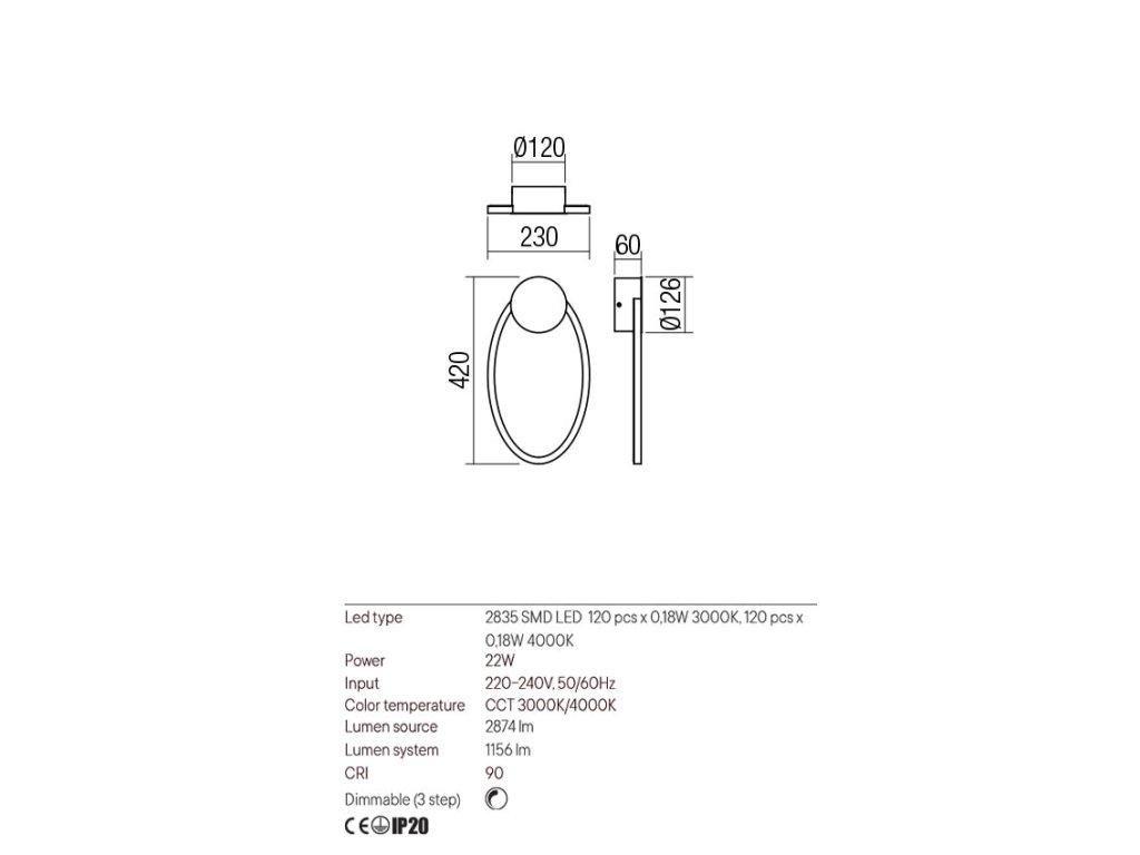 Nástenné interiérové svietidlo vybavené LED diódami SMD, s nepriamym rozptylom svetla a možnosťou voľby farebnej teploty svetla. Hliníková konštrukcia lakovaná vo viacerých farebných variantách, matný biely PVC difúzor.