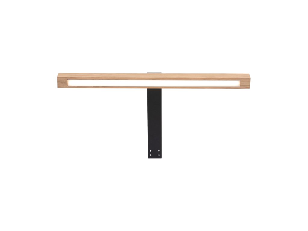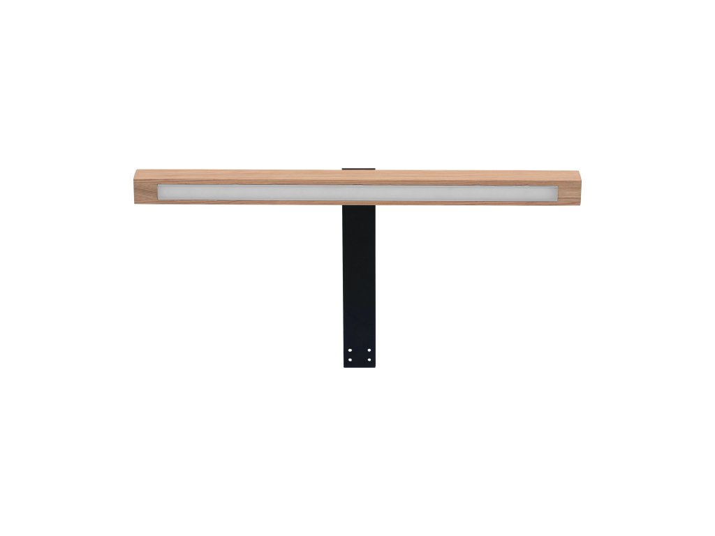 Moderné nástenné svietidlo AQUA VIVA ktorého hlava je vyrobená z dubového dreva, ktorá je usadená na štíhlom čiernom ramenami.