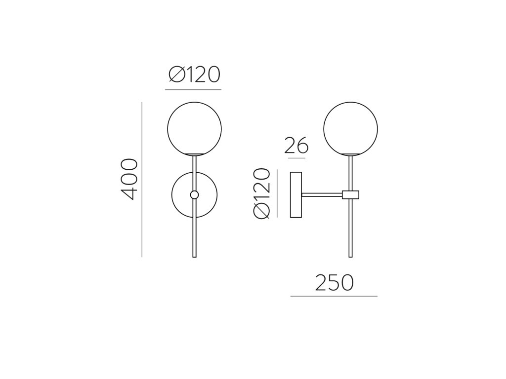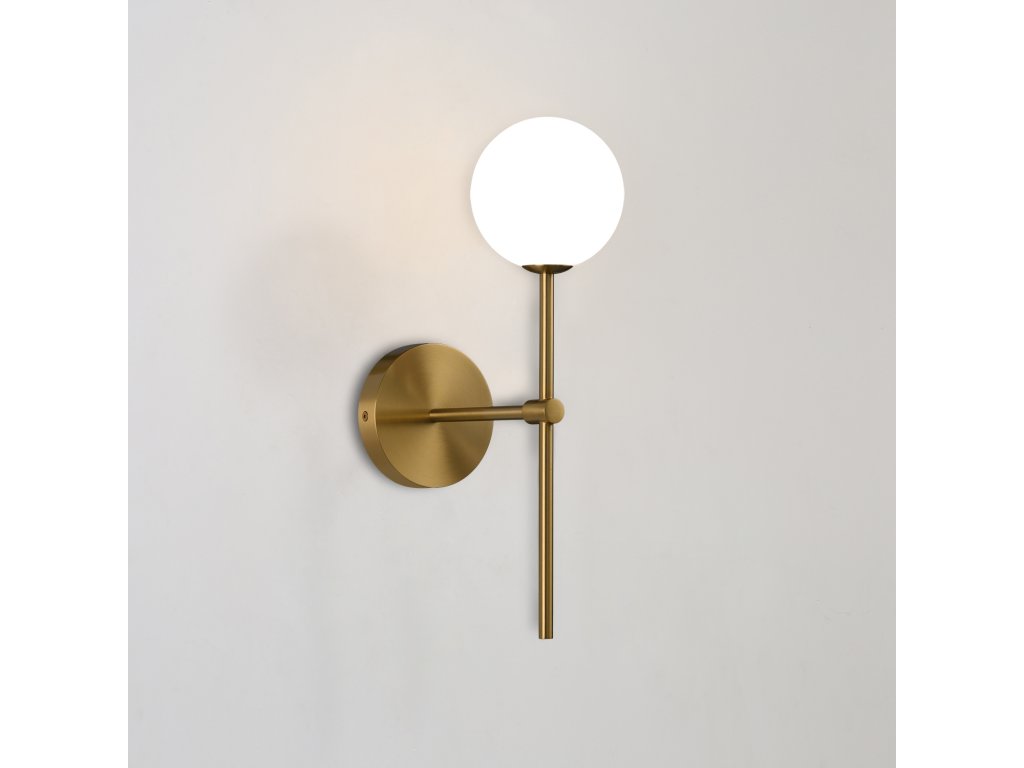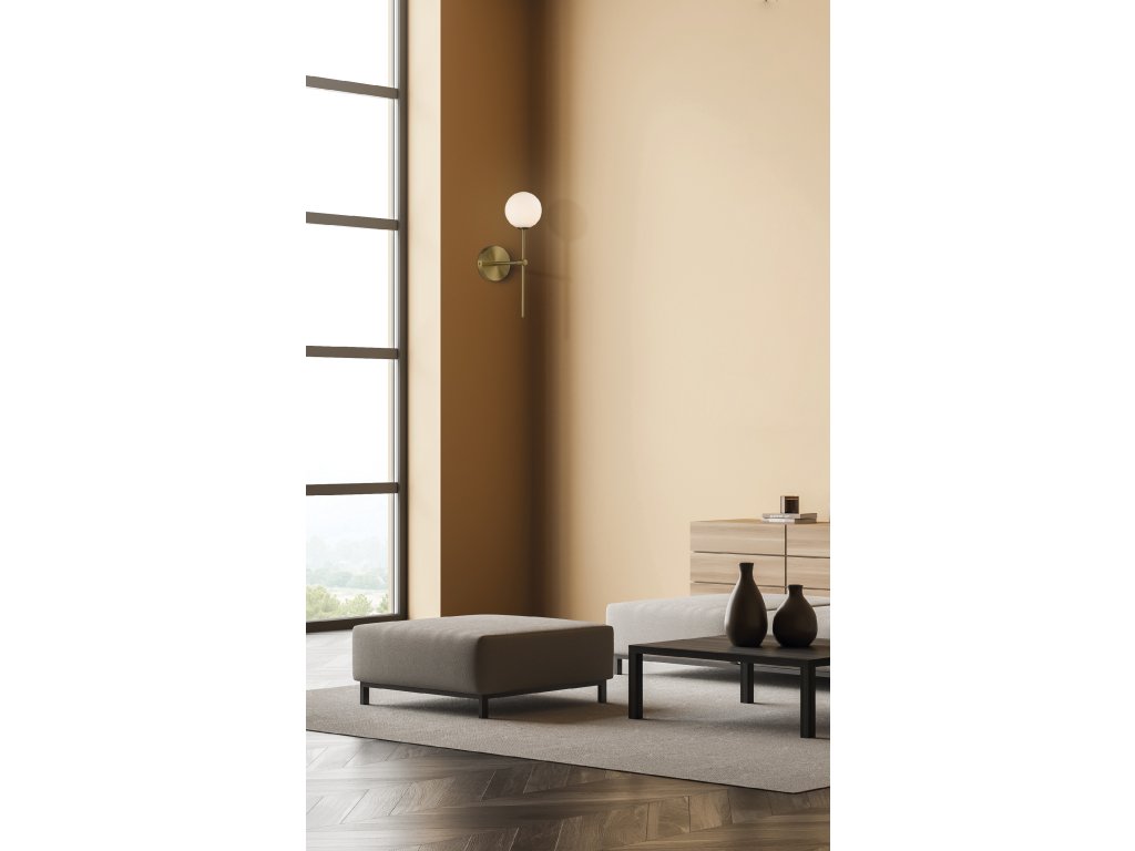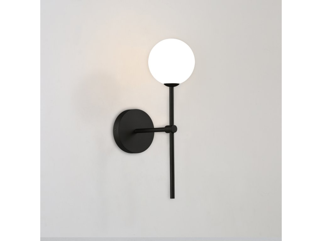 Moderné nástenné LED svietidlo DORIS sa skladá z guľatej základne na ktorej je pripevnená lineárna kovová stonka, ktorá je navrchu. zdobený opálovo bielym dvojitým skleneným difúzorom v tvare gule.