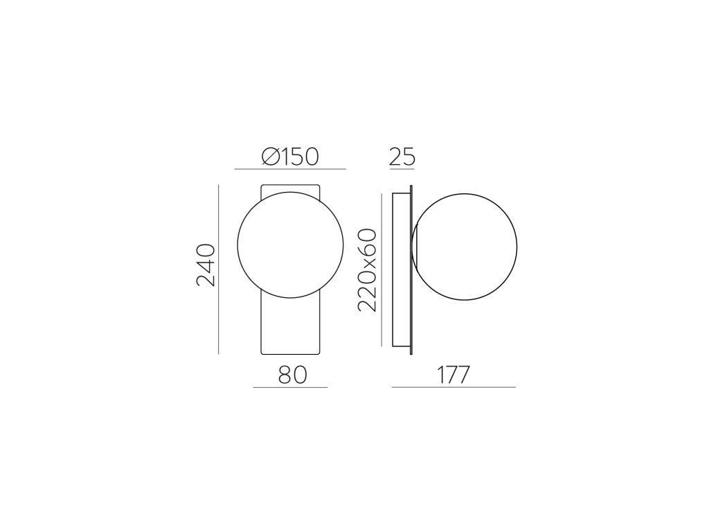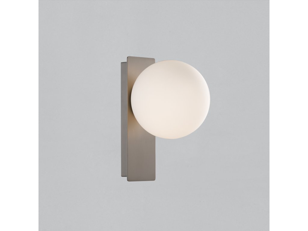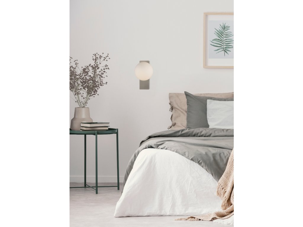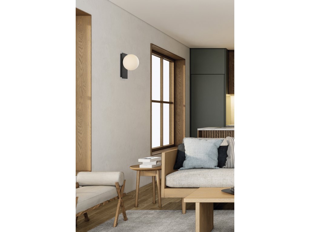 Moderné nástenné LED svietidlo KIN pozostáva z kovovej obdĺžnikovej základne, na ktorej je umiestnený opálový biely sklenený difúzor v tvare gule.