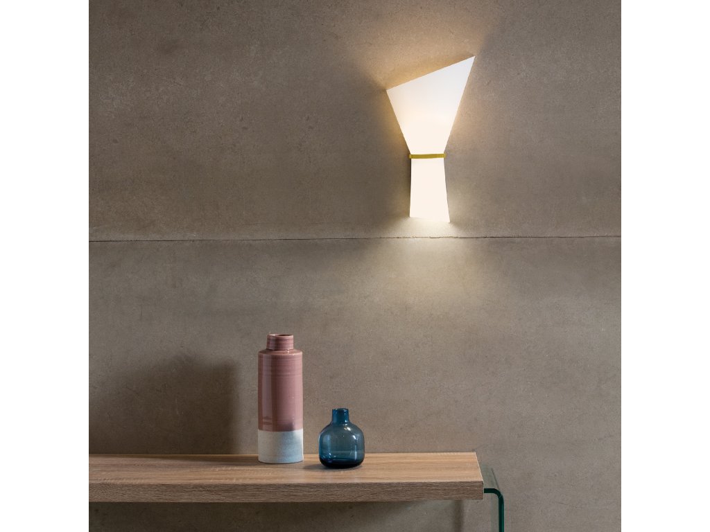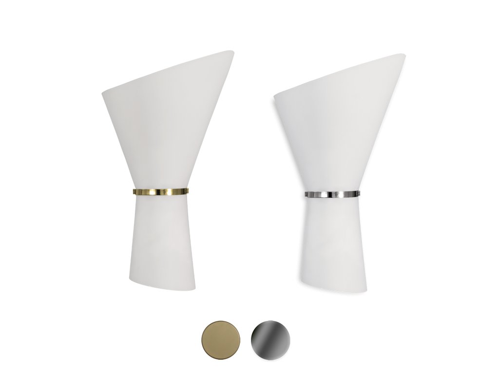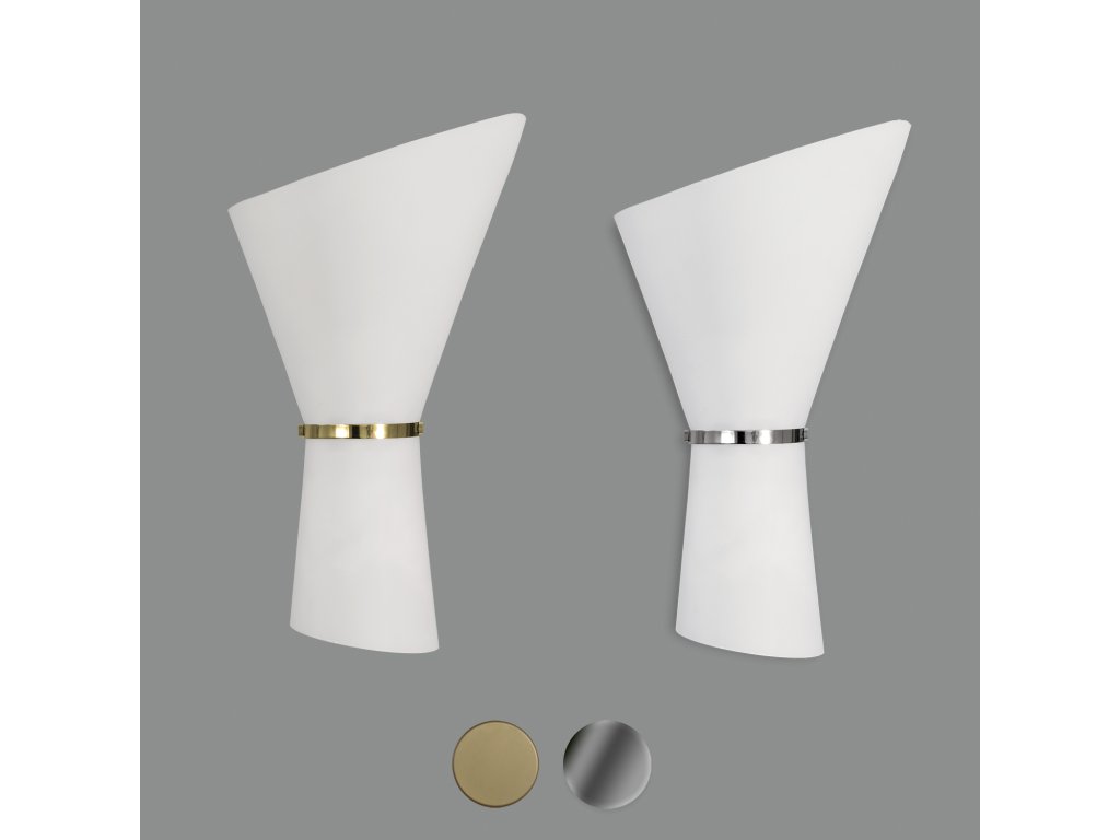 Originálne nástenné svietidlo s moderným dizajnom zo série Perla, vyrobené z kovovej základne chrómovej alebo zlatej farby a opálového dvojvrstvového skleneného difúzora s atraktívnym tvarom s obojstranným svetelným lúčom.