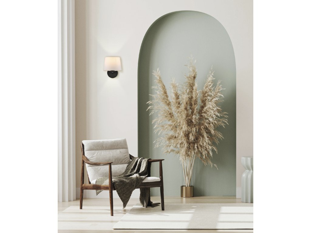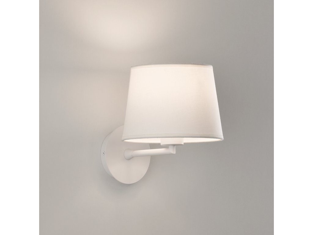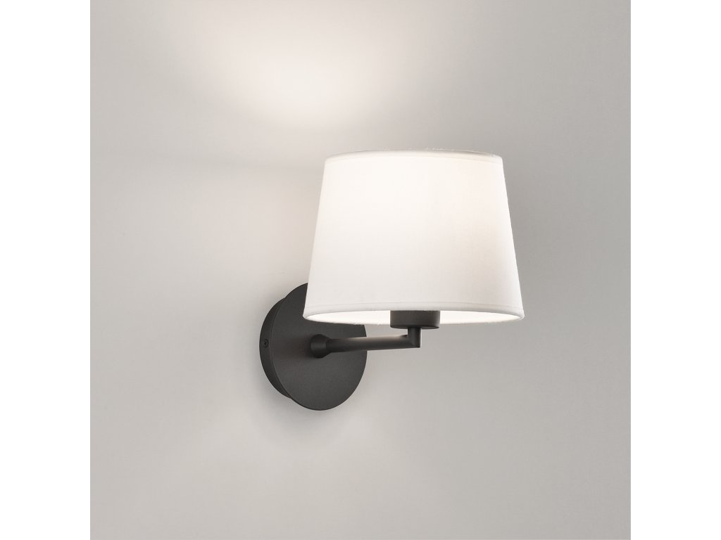 Moderné nástenné svietidlo so štýlovým dizajnom zo série Stilo, vyrobené z čiernej okrúhlej kovovej základne s ramenom a textilným tienidlom bielej farby.