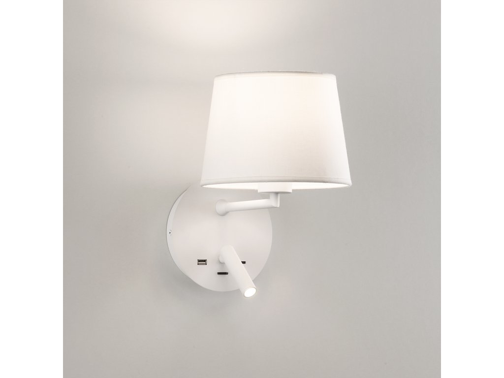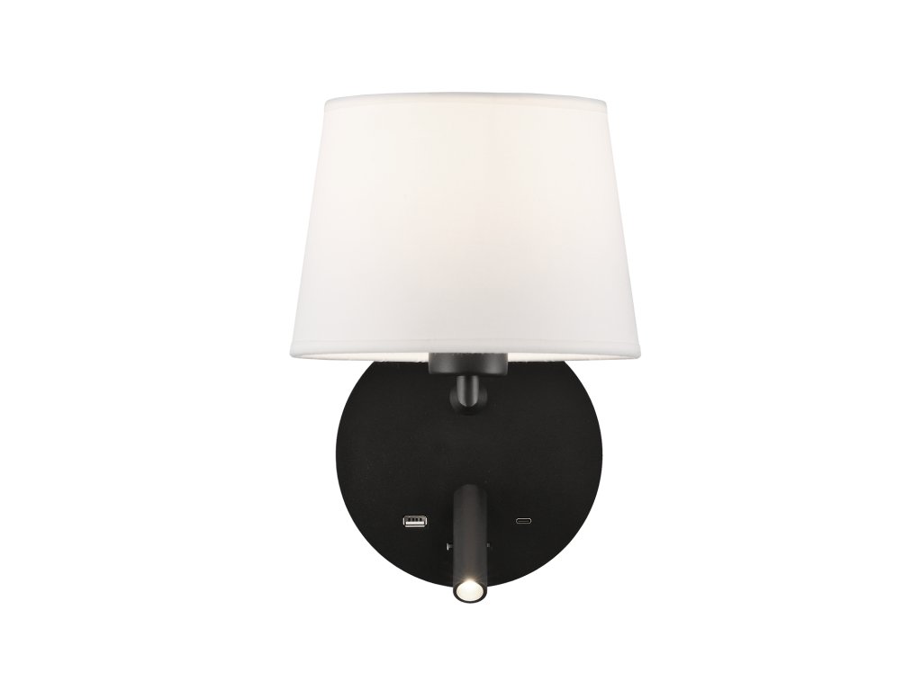 Moderné nástenné svietidlo so štýlovým dizajnom zo série Stilo, vyrobené z čiernej okrúhlej kovovej základne s ramenom, doplnené textilným tienidlom bielej farby a navyše má k dispozícii malú nastaviteľnú čítaciu bodovku.