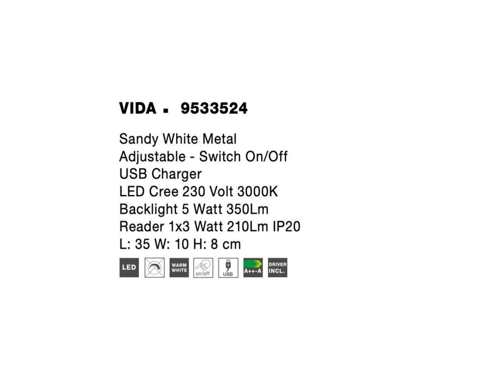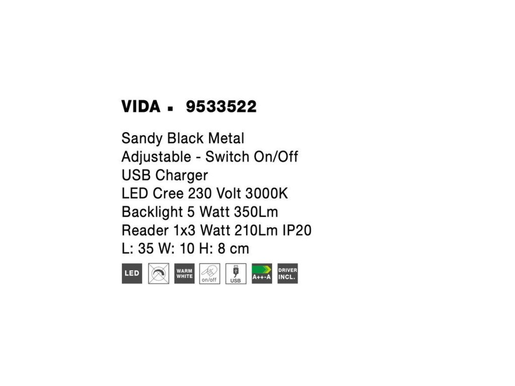 Nástenné LED svietidlo VIDA, USB nabíjanie, 3000K, čítacia lampička 1x3W