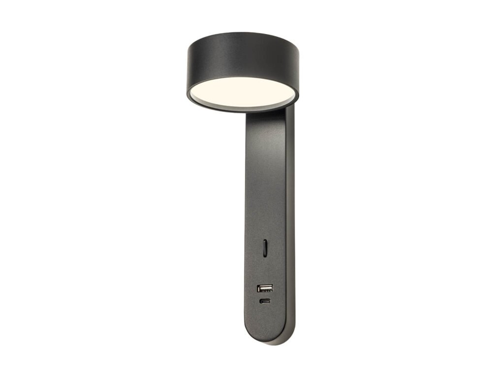 Nástenné interiérové svietidlo, vybavené LED diódami SMD, kovová a hliníková konštrukcia, lakované matnou čiernou farbou, saténový biely akrylový difúzor, vybavené nabíjacím portom USB a vypínačom.Dodatočné parametre