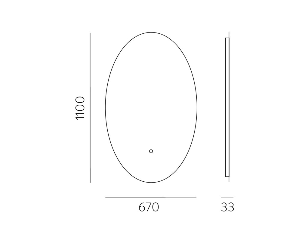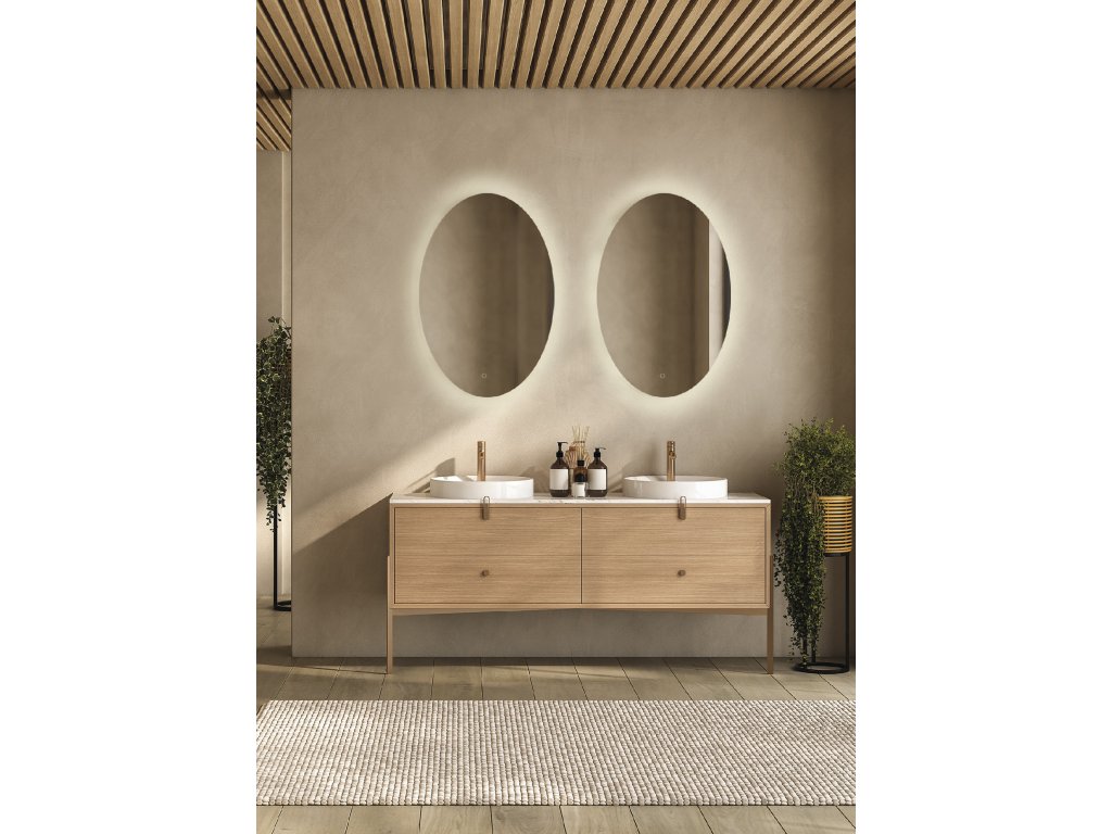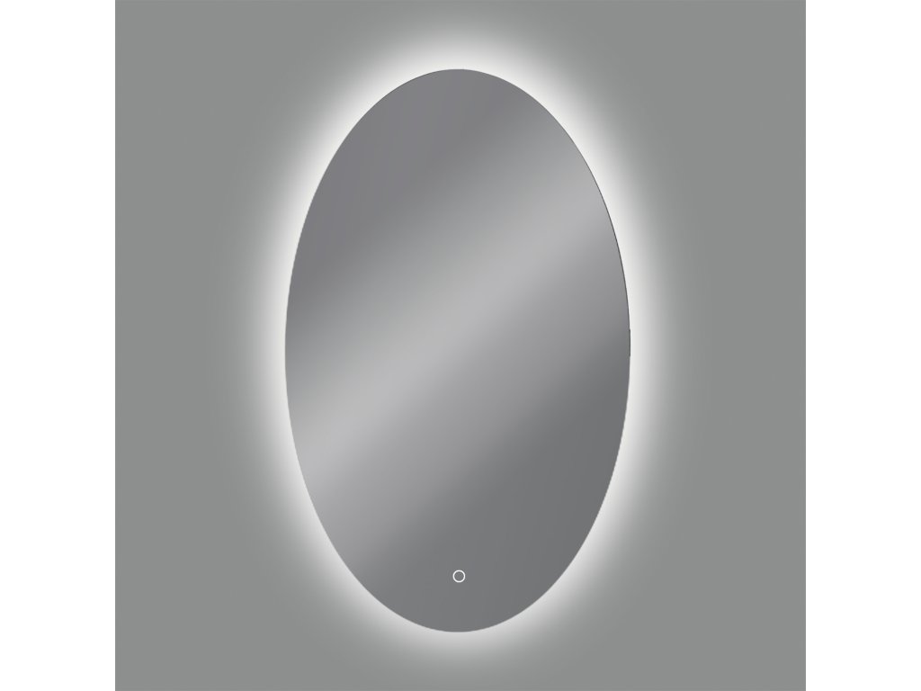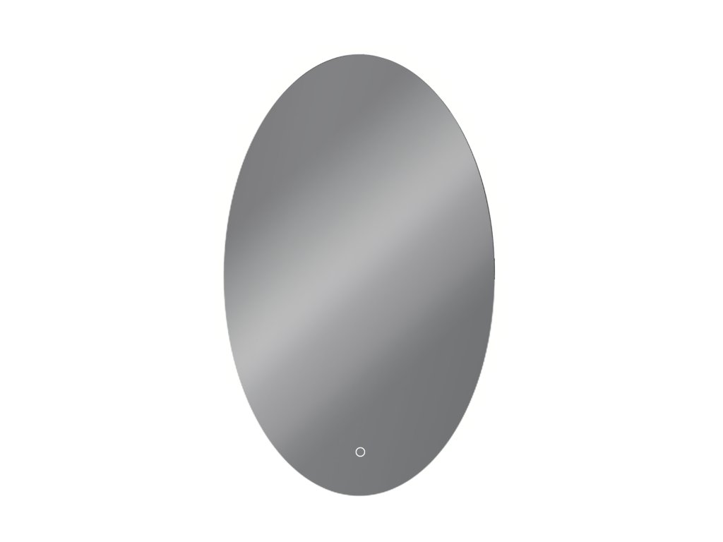 Elegantné LED kúpeľňové zrkadlo, vyrobené z oválneho kovového podstavca bielej farby, nepriamo osvetlené a zrkadlové sklo s dotykovým vypínačom ON/OFF.