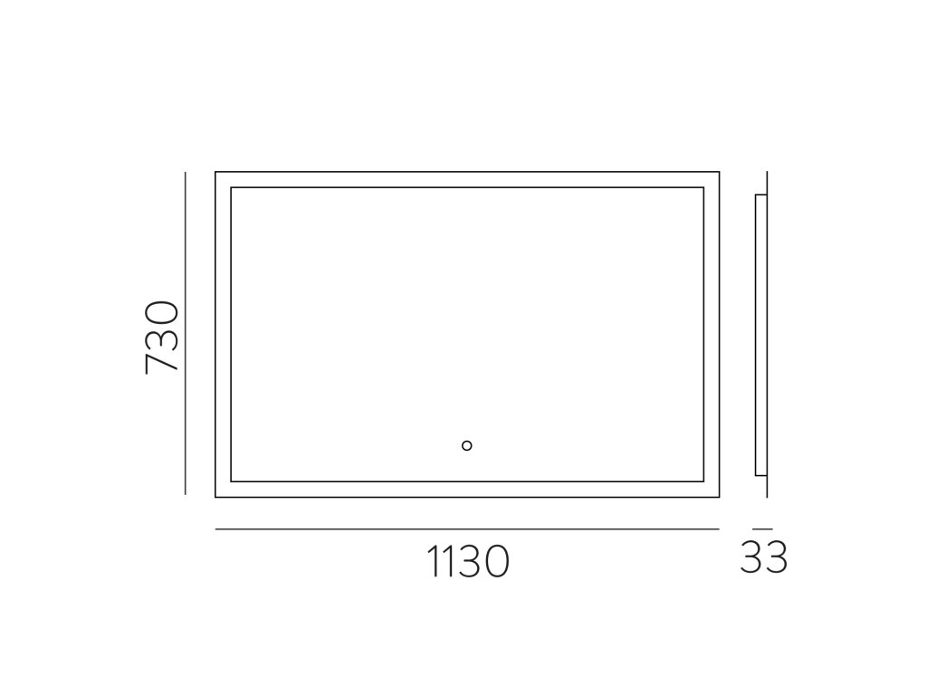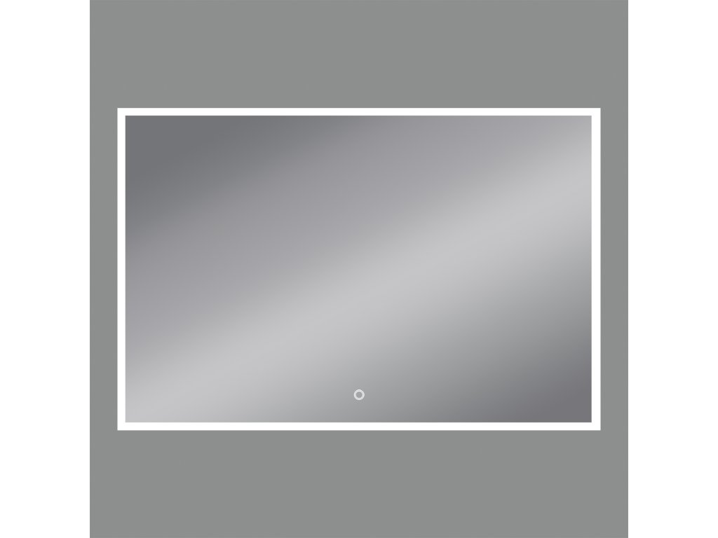 Originálne LED kúpeľňové zrkadlo zo série Amanzi, vyrobené z obdĺžnikového kovového podstavca bielej farby, na okrajoch osvetleného a zrkadlového skla s dotykovým vypínačom ON/OFF.