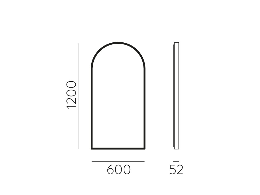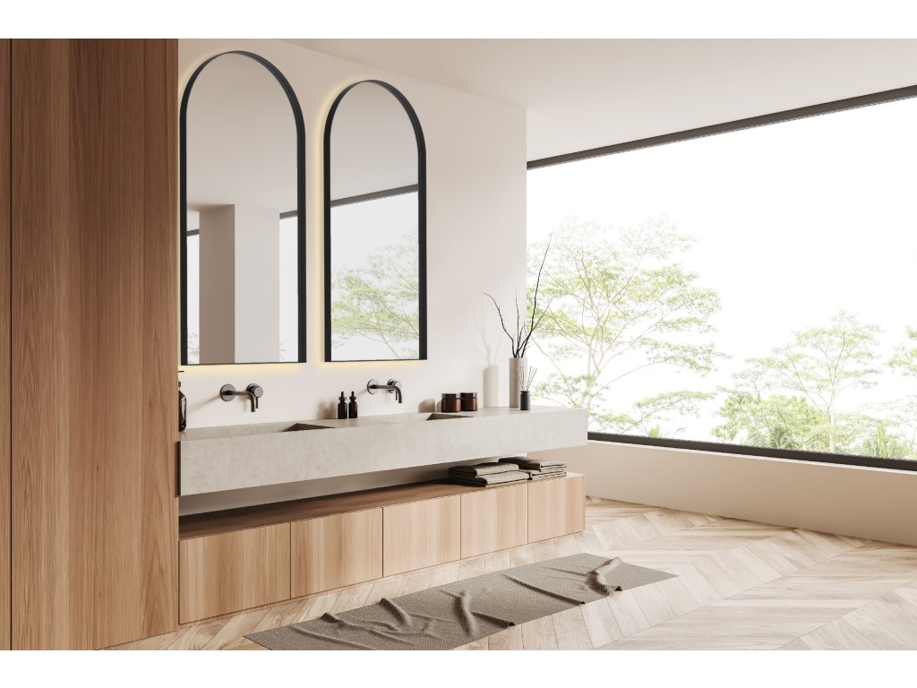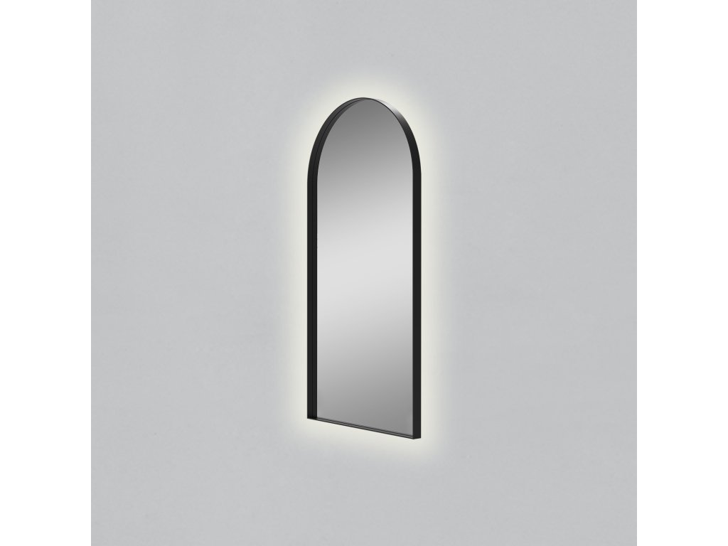 Moderné LED kúpeľňové zrkadlo zo série Giorgia v tvare oblúkového okna s podsvietením.