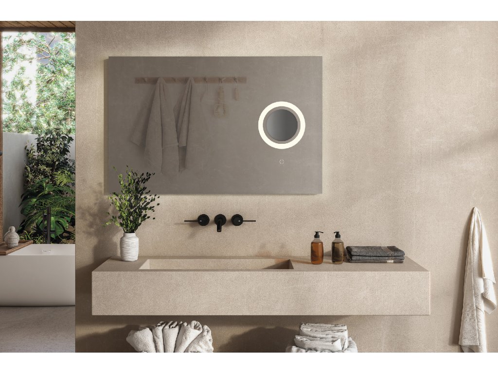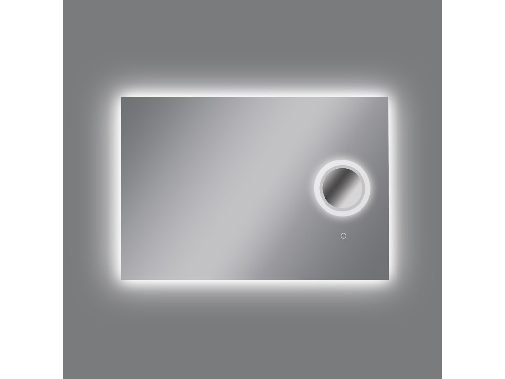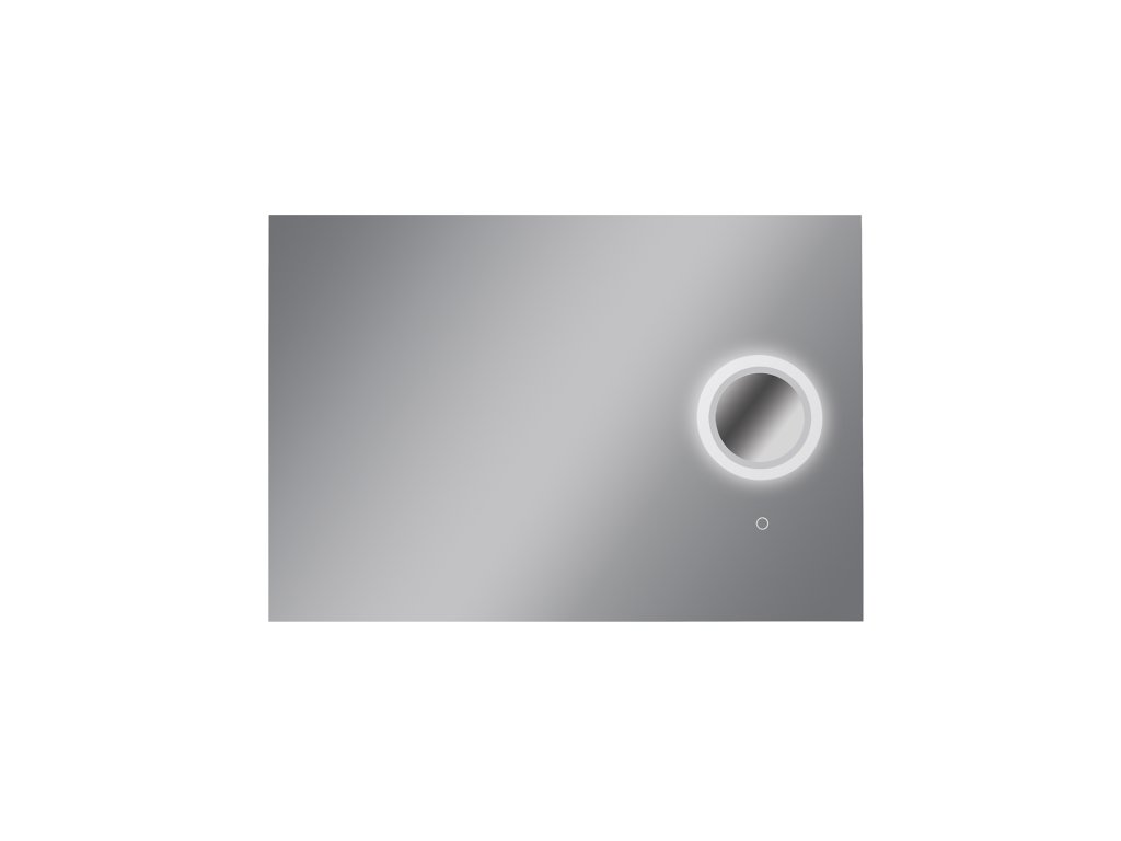 Moderné LED kúpeľňové zrkadlo zo série Olter, vyrobené z obdĺžnikového kovového podstavca bielej farby, s podsvieteným zrkadlovým sklom a okrúhlym 5x zväčšovacím zrkadlom s LED svetlom, ktoré sa zapína dotykovým vypínačom ON/OFF.