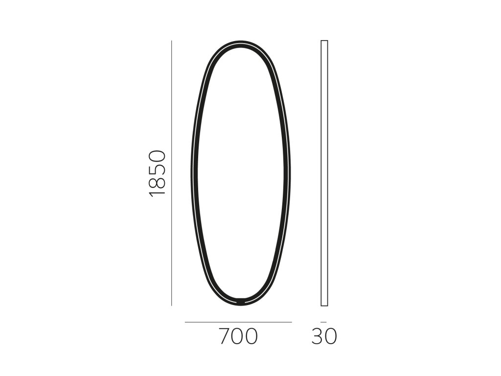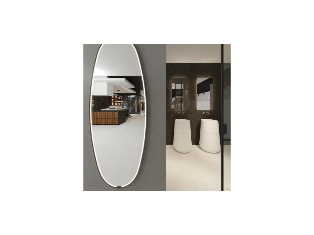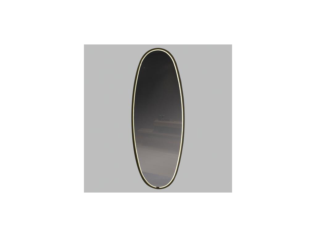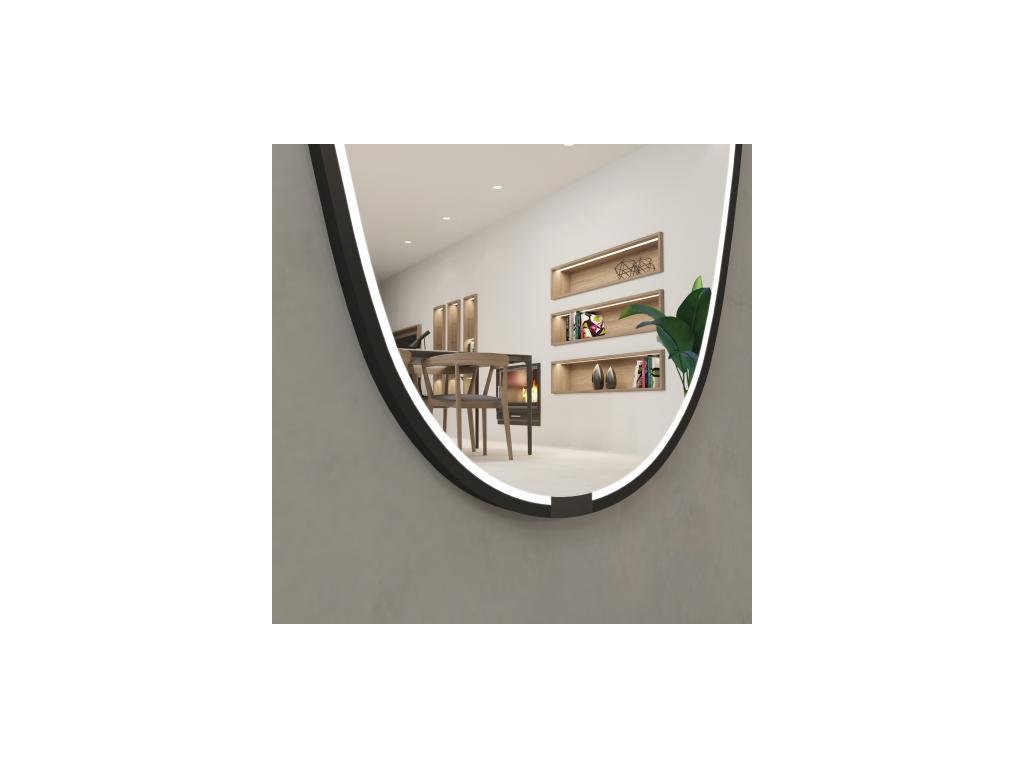 Štýlové LED kúpeľňové zrkadlo, vyrobené z čierneho eliptického kovového rámu a zrkadlového skla s integrovanými LED diódami, s priamym svietením.