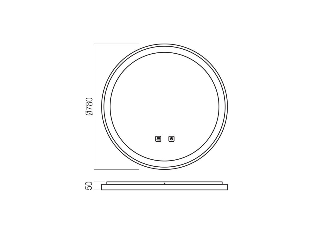 Zrkadlo s vnútorným osvetlením, chránené proti vlhkosti, vybavené SMD LED, dotykovým spínačom a stmievačom, voľbou teploty farby svetla od teplej bielej po studenú bielu a funkciou odhmlievania. Hliníková a kovová konštrukcia lakovaná pieskovo čiernou, bielou alebo zlatou farbou, opálovo biely akrylový difúzor a zrkadlo.