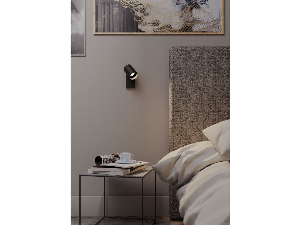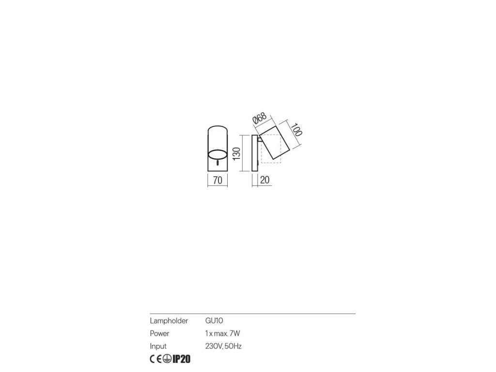 Orientovateľné nástenné svietidlo do interiéru, konštrukcia z kovu a lisovaného hliníka, elektrostaticky lakované pieskovo bielou farbou s matne čiernymi detailmi, vybavené vypínačom. Zdroj GU10 nie je súčasťou balenia.