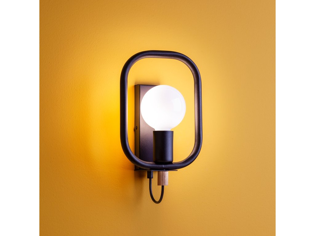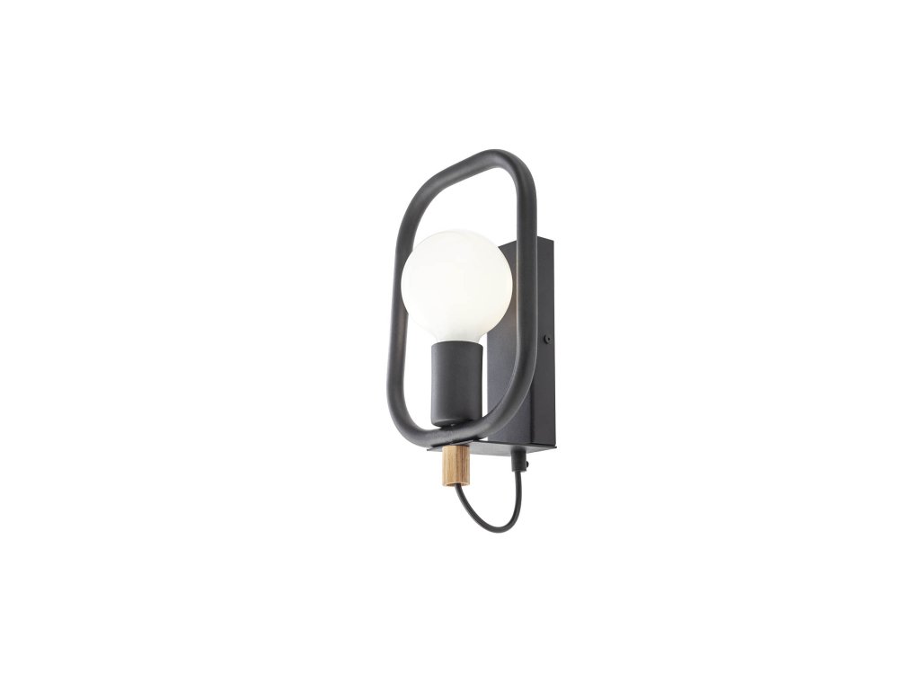 Nástenná lampa do interiéru, kovová konštrukcia lakovaná matnou čiernou farbou s detailmi z prírodného dreva.