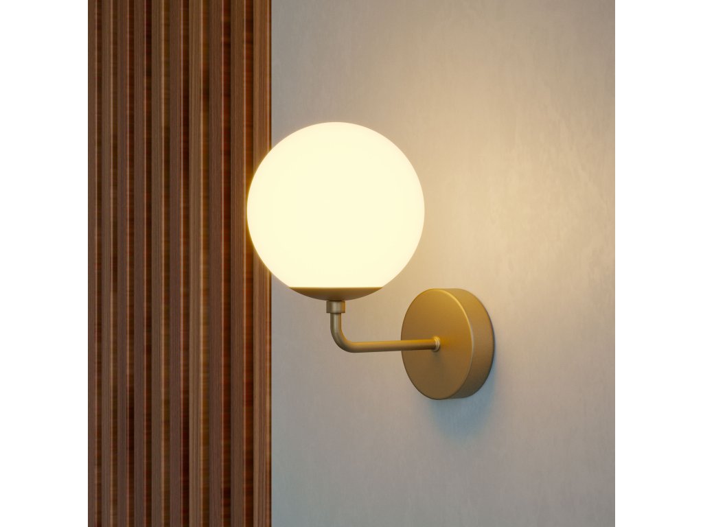 Nástenné interiérové svietidlo, kovová konštrukcia lakovaná pieskovo čiernou alebo medenou farbou, opálovo biely difúzor z fúkaného skla.