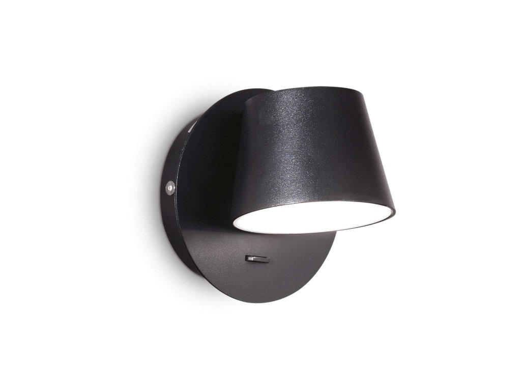 Nástenné LED bodové svietidlo Gim AP1 v elegantnom čiernom prevedení z kolekcie interiérového osvetlenia Ideal Lux má na spodnej časti kruhovej základne umiestnený vypínač a svoje uplatnenie tak nájde v spálni alebo obývačke ako lampička na čítanie. Svietidlo je vyrobené z liateho hliníka s vonkajšou povrchovou práškovo lakovanou čiernou úpravou v kombinácii s akrylovým tienidlom. Hlavu bodovky je možné natáčať a tým nastavovať tok svetla, ktoré zaisťuje integrovaný úsporný LED zdroj s maximálnym príkonom 1 x 6 W s príjemným teplým bielym svetlom 3000K a životnosťou až 15.000 hodín. Zdroj je súčasťou svietidla bez možnej výmeny. Výrobca posyktuje predĺženú záruku 3 roky.Dodatočné parametre