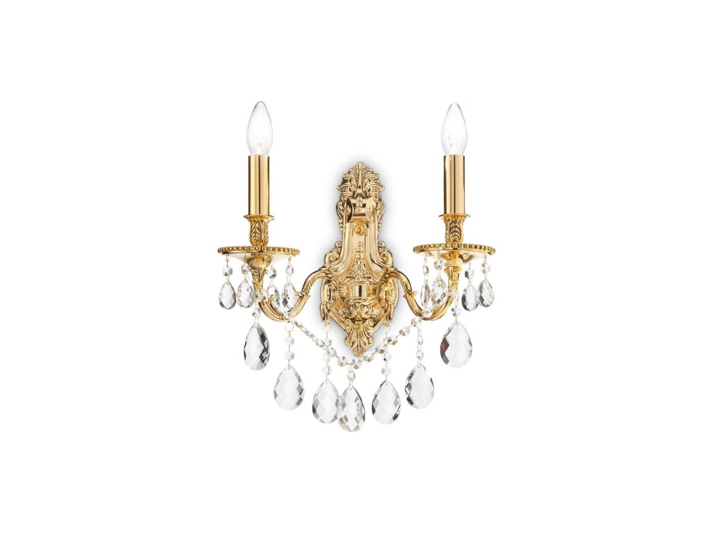 Nástenné svietidlo Gioconda z kolekcie interiérového osvetlenia značky Ideal Lux s klasickým krištáľovým designom. Je vhodné na osvietenie stien dlhých chodieb luxusných víl, hotelov a reštaurácií. Telo svietidla je zhotovené z liateho kovu so zlatou povrchovou úpravou so starožitným efektom. Ramená sú zdobené osemhrannými a okrúhlymi brúsenými krištáľmi. Svietidlo je osadené päticami E14 pre žiarovky s maximálnym príkonom 2 x 40 W. Zdroje nie sú súčasťou balenia. Odporúčame zvoliť LED žiarovky na úsporu elektrickej energie. Krytie IP20 je vhodné pre vnútornú inštaláciu. Celkové rozmery svietidla sú 42,5 x 31 x 21,5 cm. Je určené na napájanie zo siete na 220-240 V a vzťahuje sa naň predĺžená záruka 5 rokov.Dodatočné parametre