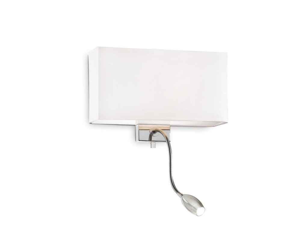 Obdĺžnikové nástenné svietidlo Hotel z kolekcie interiérového osvetlenia značky Ideal Lux s čítacím svetlom s dĺžkou 32 cm v bielej farbe svojim nenápadným vzhľadom ozdobí akýkoľvek interiér. Vhodne nasvietia steny obývacích priestorov, spálne alebo hotelových interiérov. Tienidlo vyrobené z textílie v bielej farbe dopĺňa difúzor z mliečneho skla. Vnútri svietidla je umiestnená pätica E27 s maximálnym príkonom 1 x 60 W. Žiarovka nie je súčasťou balenia. Odporúčame použiť úsporný LED svetelný zdroj s dlhou životnosťou. Čítacie pohyblivé rameno je zhotovené z kovu v chrómovej farbe a vyžaruje teplé biele svetlo s teplotou chromatickosti 3000 K, ktoré poskytuje integrovaný LED zdroj s príkonom 1 x 1 W a svietivosťou 55 lm. Životnosť dosahuje až 20 000 hodín. Svit je vyžarovaný v uhle 23 stupňov. Na základni je prakticky umiestnený samostatný vypínač pre tento zdroj. Krytie IP20 je vhodné na použitie do interiéru. Celkové rozmery svietidla sú 22,5 x 32 x 11 cm. Je určené na napájanie zo siete na 220-240 V a vzťahuje sa naň predĺžená záruka 5 rokov.Dodatočné parametre
