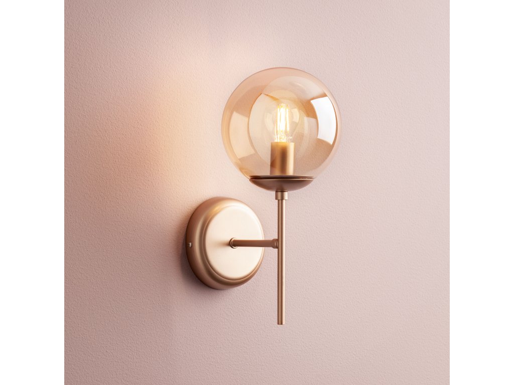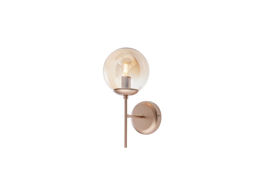 Interiérové nástenné svietidlo, kovová konštrukcia lakovaná v matnom šampanskom, difúzor z fúkaného skla v jantárovej farbe.