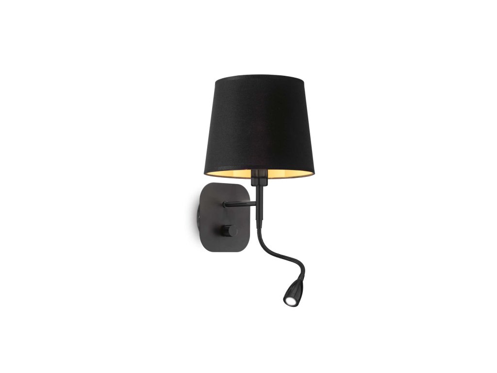 Nástenná LED lampička Nordik AP2 v elegantnom čierno-zlatom prevedení je ideálnou voľbou do spálne ako jemné osvetlenie na čítanie. Svoje uplatnenie nájde aj v hotelových izbách. Svietidlo je rozdelené do dvoch častí. Horné plastové tienidlo v zlatistej farbe pre príjemný odraz svetla s čiernym vonkajším textilným povrchom je vo vnútri osadené päticou E14 pre žiarovku s maximálnym príkonom 1 x 40 W en. triedy A++ až E, ktorá nie je dodávaná v balení. V spodnej časti je samostatná LED lampička s flexibilným ramenom pre možnosť variabilného nastavenia toku svetla v príjemnom teplom bielom odtieni 3000K s príkonom 1 x 1 W. Tento LED zdroj energetickej triedy A+ so životnosťou až 15.000 hodín je integrovaný bez možnej výmeny. Telo svietidla je vyrobené z kovu s vonkajšou čiernou matnou povrchovou úpravou. Vypínač je umiestnený na základni s priemerom 10 cm.Dodatočné parametre