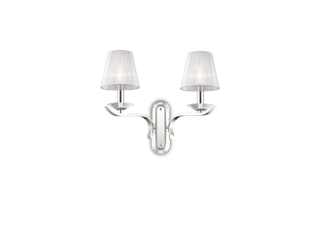 Nástenné svietidlo Pegaso z kolekcie dizajnového osvetlenia značky Ideal Lux v klasickom prevedení s dvoma ramenami je ideálnou voľbou na osvietenie stien obývacej izby, predsiene či spálne. Jeho rám je zhotovený z kvalitného kovu s chrómovou povrchovou úpravou. Tienidlá sú vyrobené z bielej organzy. Ramená sú zdobené krištáľovými kalíškami. Sú osadené päticami E14 pre žiarovky s maximálnym príkonom 2 x 40 W. Zdroje nie sú súčasťou balenia. Odporúčame zvoliť LED filamentové žiarovky v tvare sviečky na úsporu elektrickej energie. Krytie IP20 je vhodné pre vnútornú inštaláciu. Celkové rozmery svietidla sú 33,5 x 43 x 20,5 cm. Svietidlo je určené na napájanie zo siete na 220-240 V.Dodatočné parametre