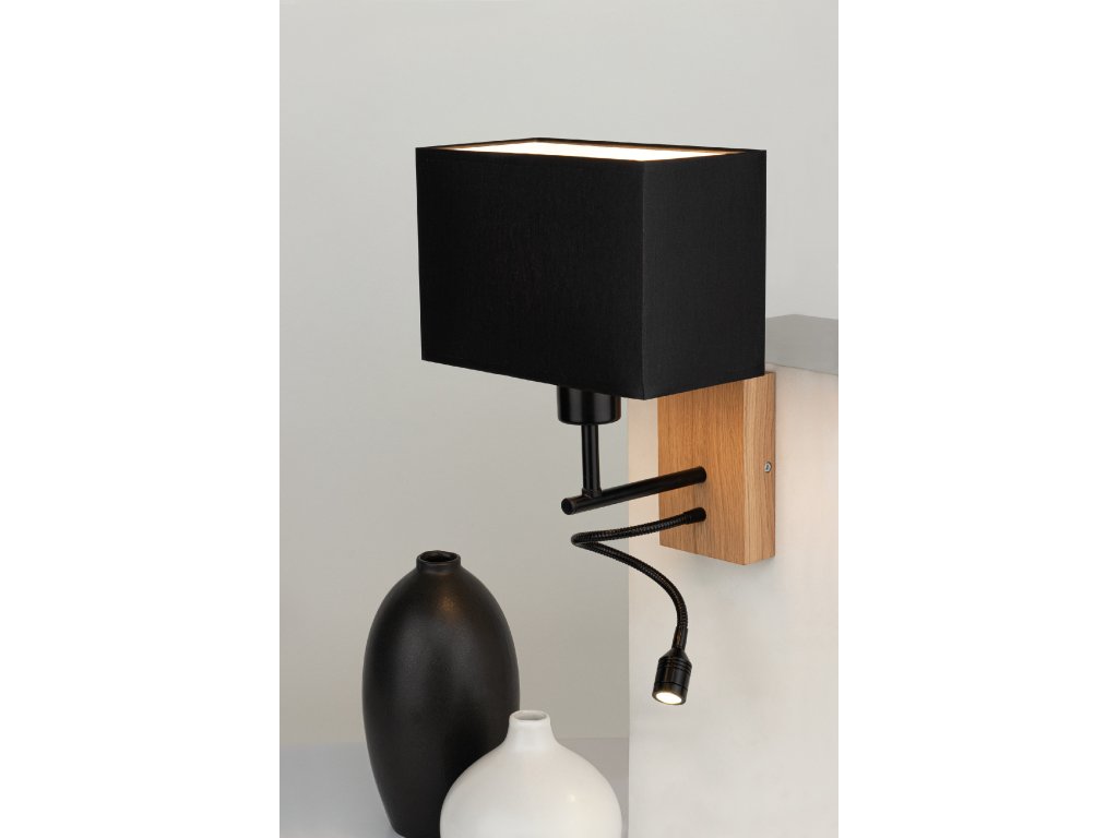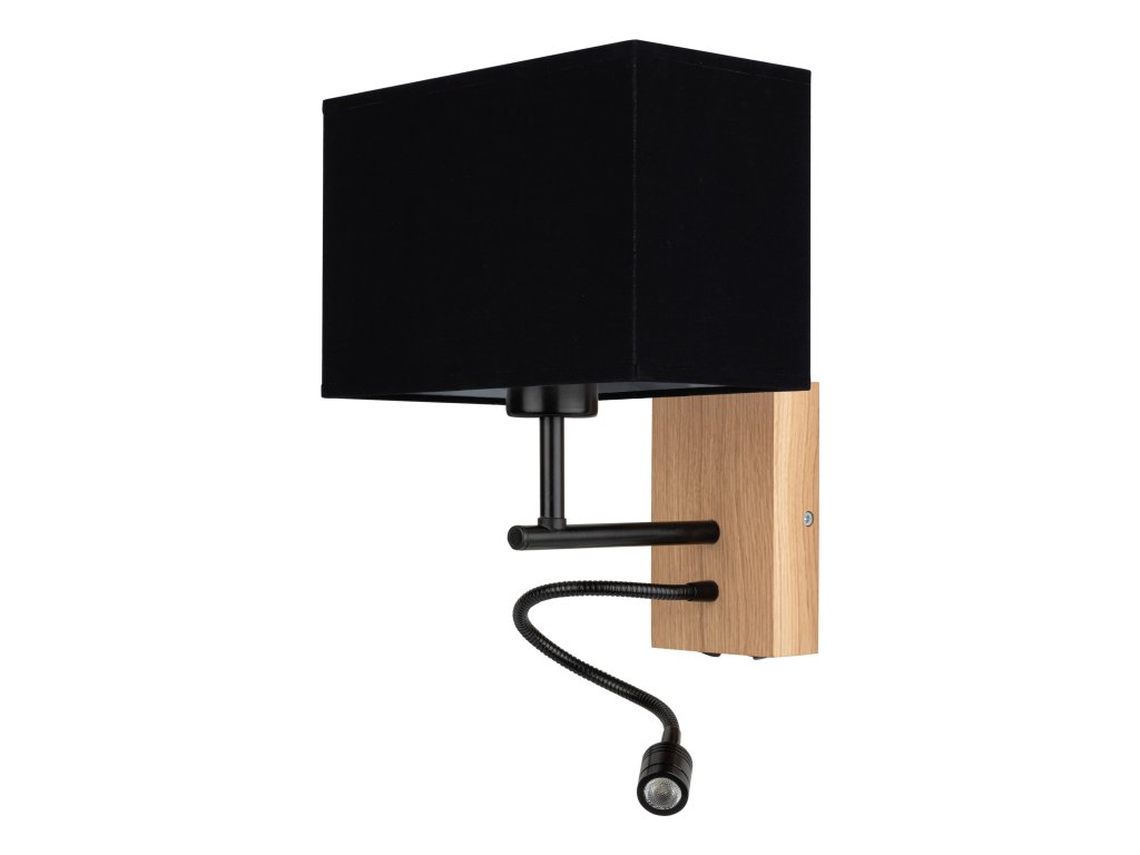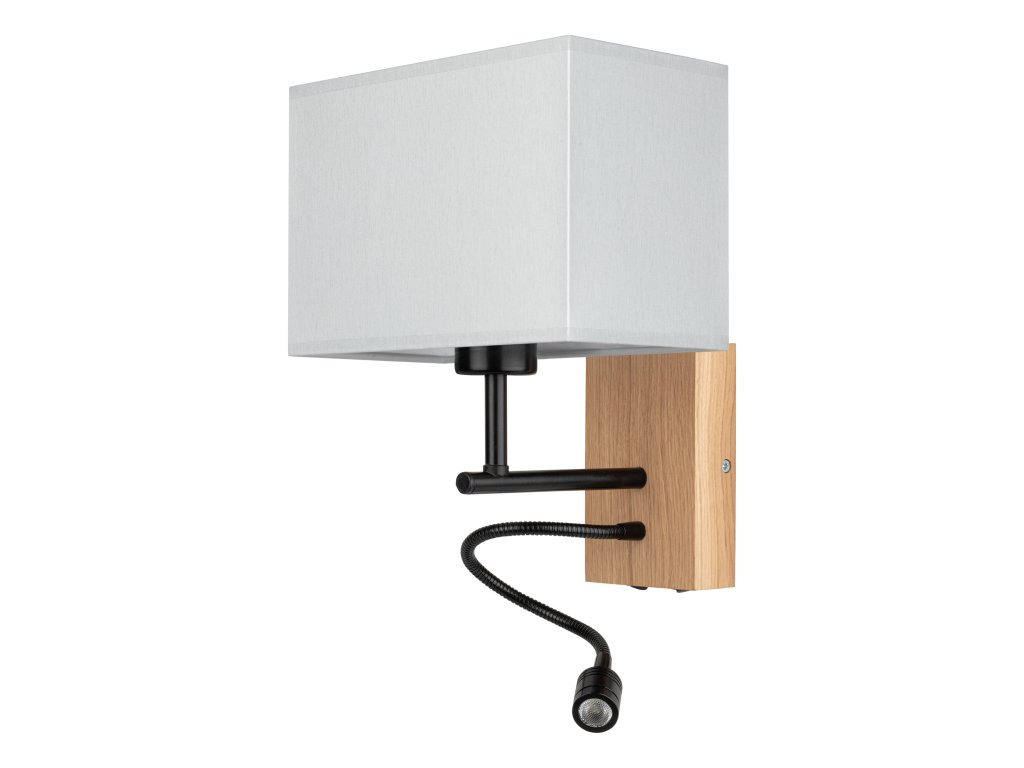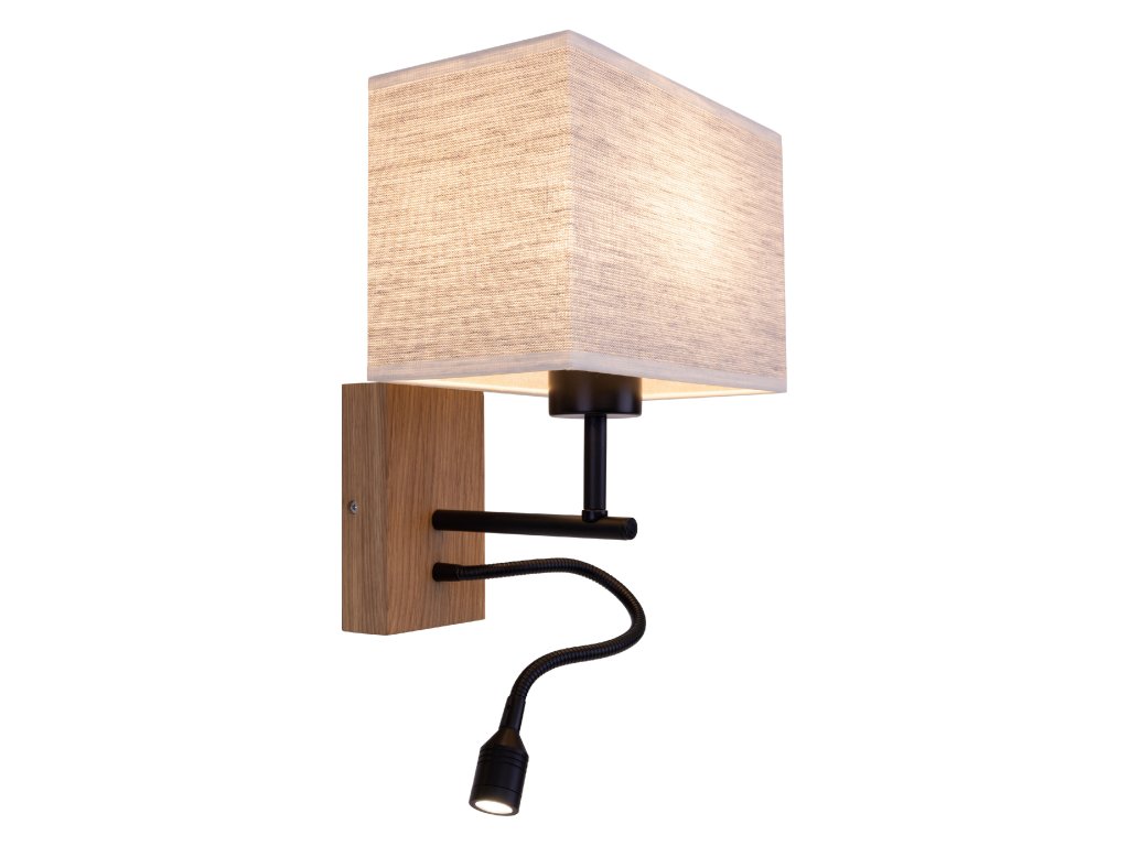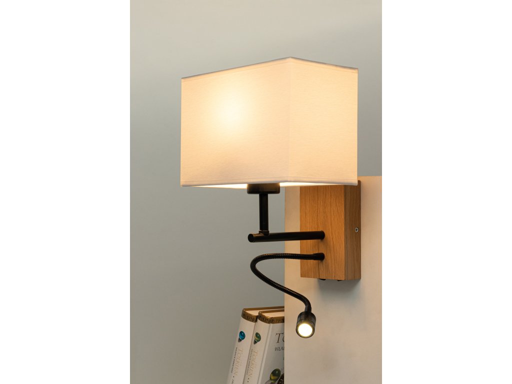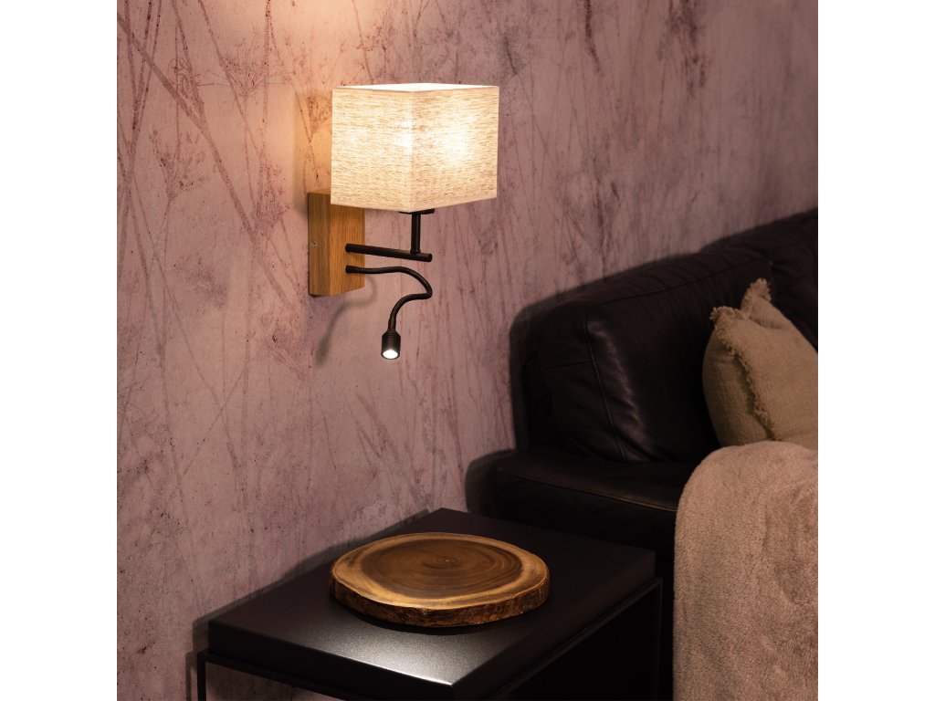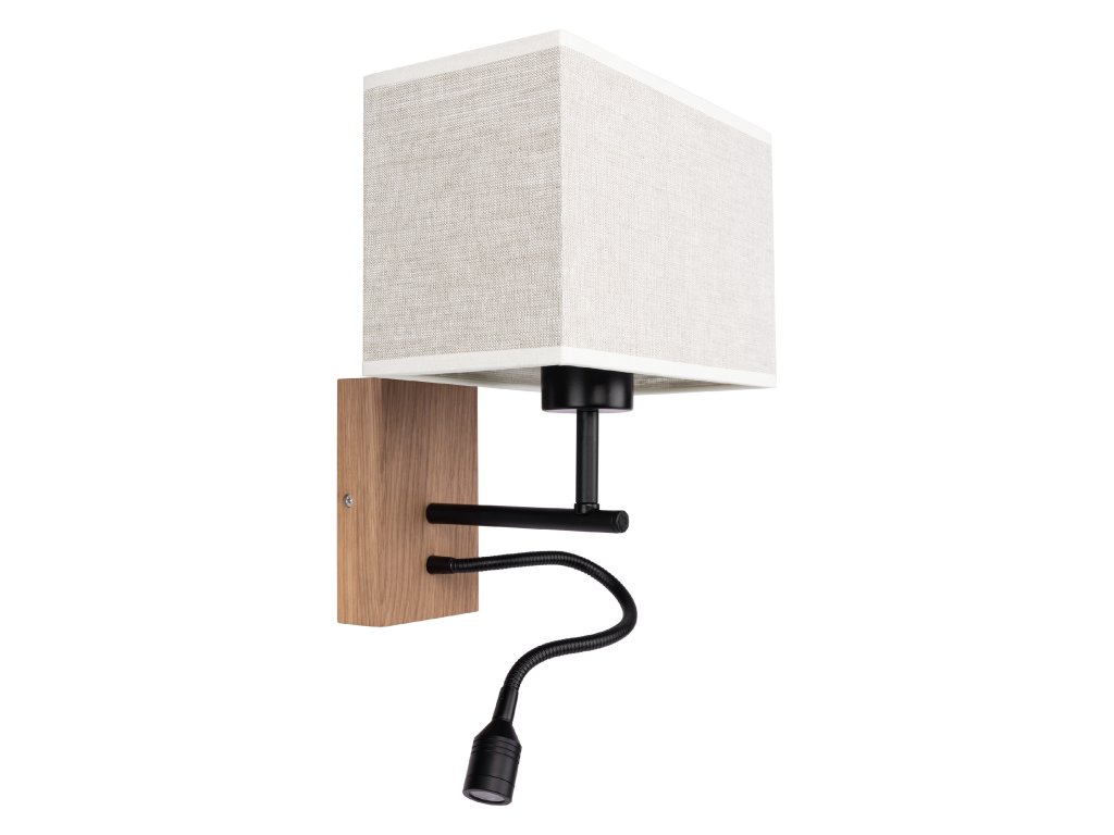 Nástenné svietidlo BOHO SONAR s hranatým ľanovým tienidlom s konštrukciou v kombinácii z kovu a dubového dreva s flexibilným čítacím ramenom.
