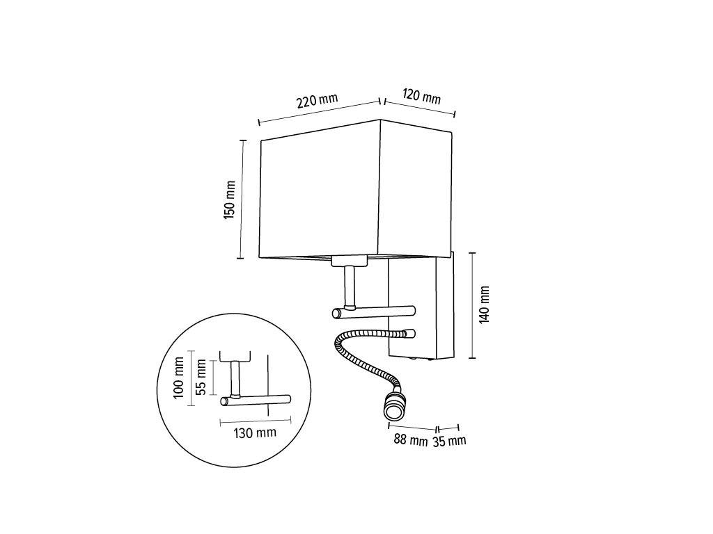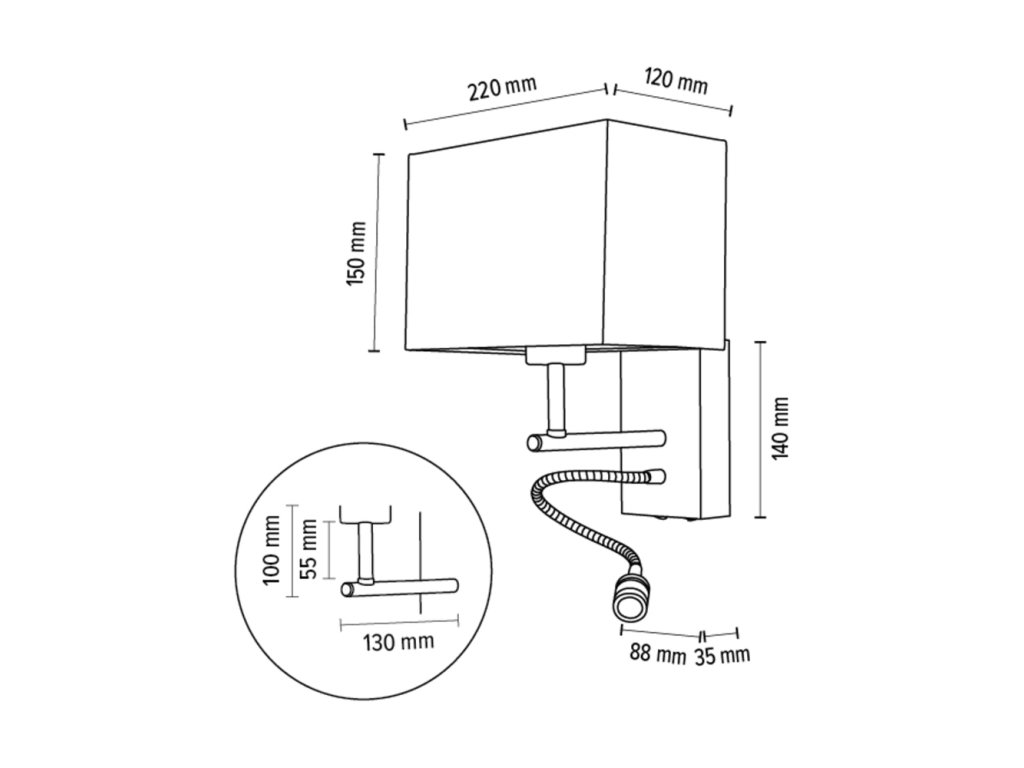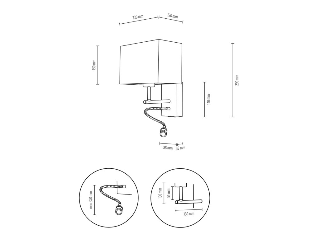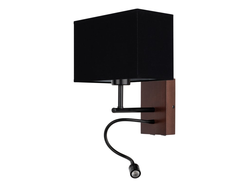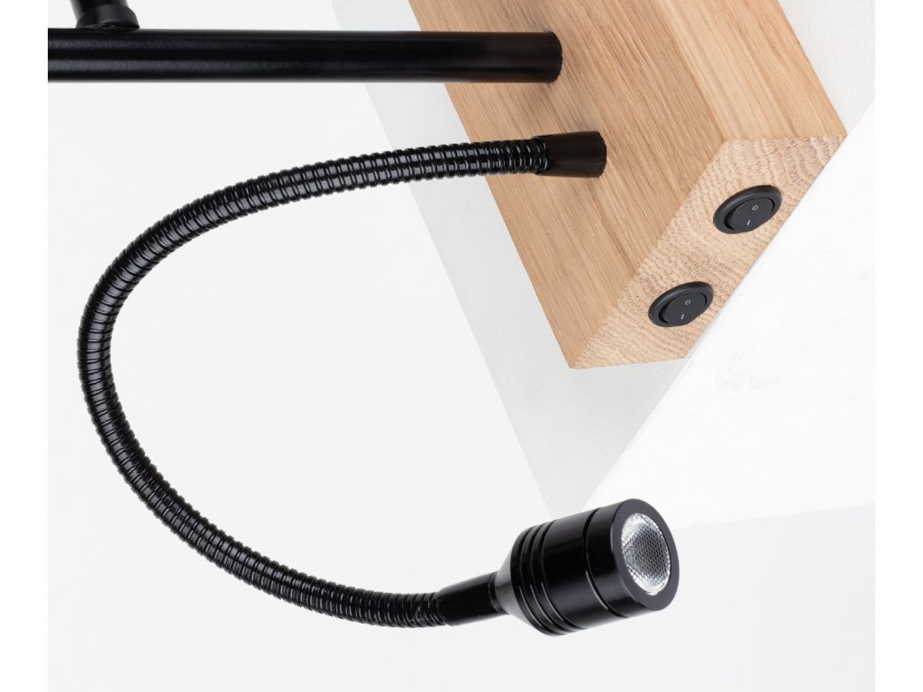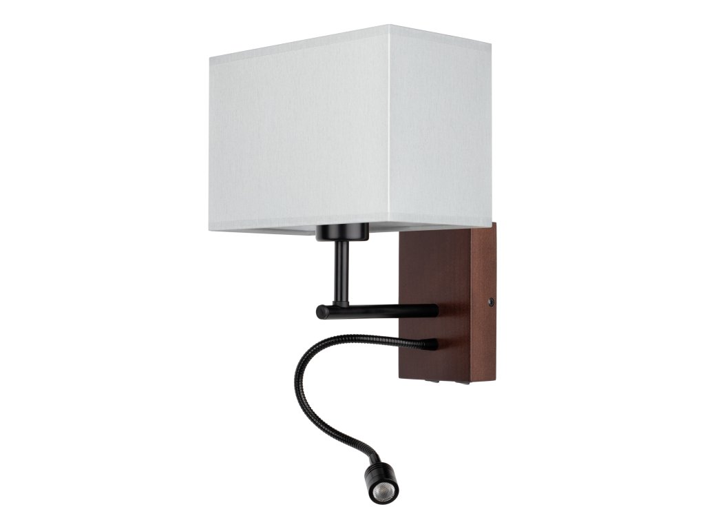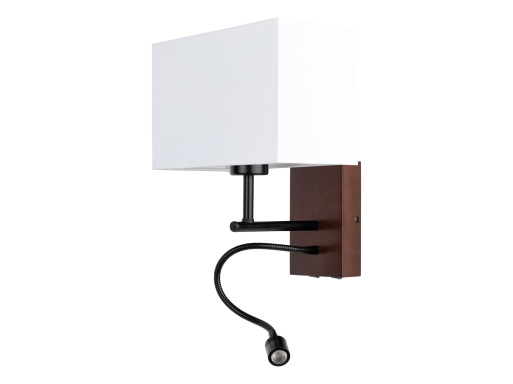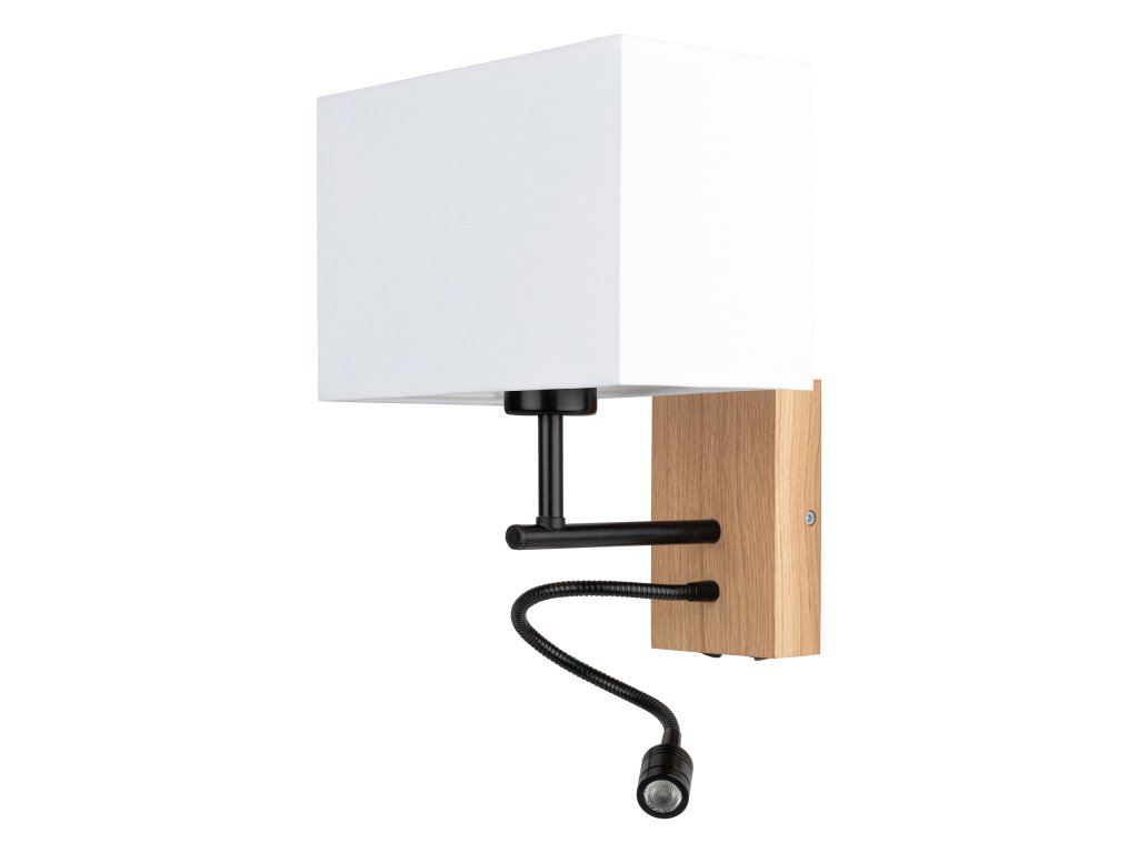 Nástenné svietidlo BOHO SONAR s hranatým ľanovým tienidlom s konštrukciou v kombinácii z kovu a dubového dreva s flexibilným čítacím ramenom.