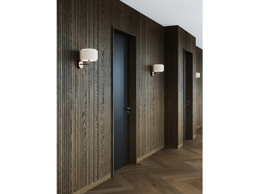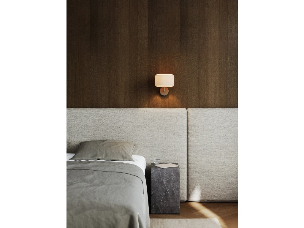 Nástenné svietidlo Takai od štúdia Mavro//Lefèvre by Sofia Lefèvre má látkové tienidlo krásneho tvaru, ktoré nabáda k pohľadu z rôznych uhlov. Kombinácia tienidla z ľanového plátna a podstavca z leštenej mosadze vytvára veľmi jemný a hrejivý dizajnový jazyk.