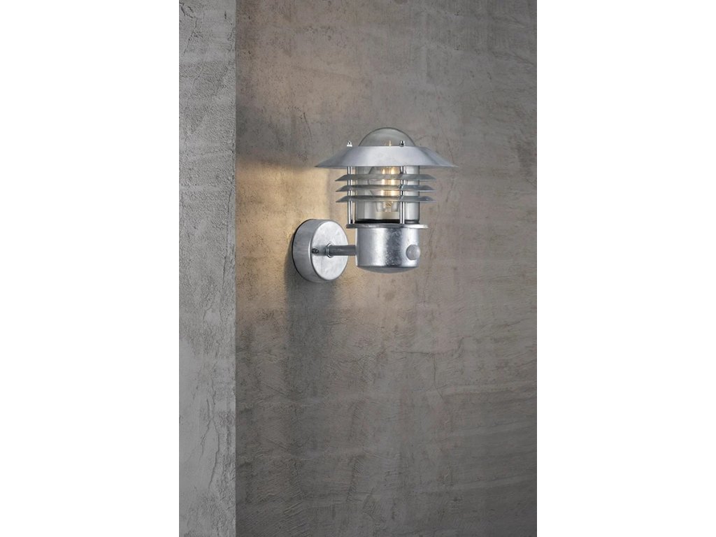 Vonkajšie nástenné svietidlo s integrovaným pohybovým senzorom spája funkčnosť a jedinečný design. Je tvorené guľatou základňou a robustnou hlavou smerujúcou nahor, ktorá zahŕňa oblý sklenený difúzor krytý dekoratívnou strieškou a doplnený kruhovými prvkami, ktoré dodávajú svietidlu originálny vzhľad. Pohybový senzor zaisťuje praktické automatické rozsvietenie, čo oceníte najmä pri vstupe do domu alebo na terase.