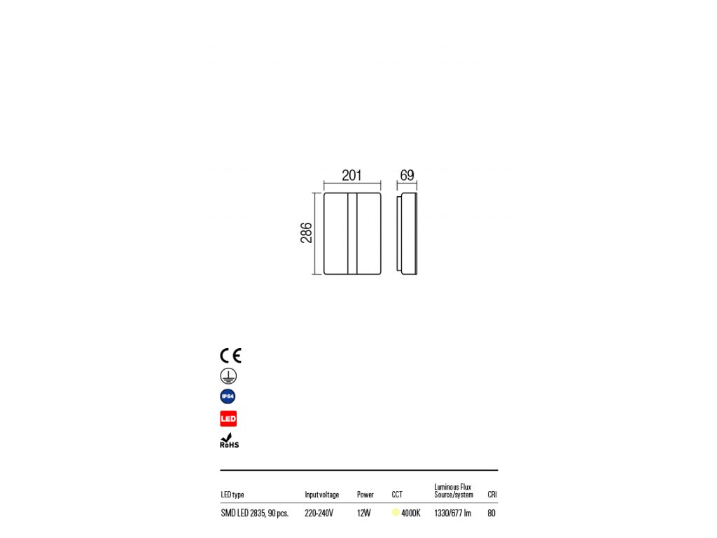 Nástenná vonkajšia lampa, vybavená SMD LED diódami a podávačom, liate hliníkové telo, je elektrostaticky natretá tmavo šedým alebo hnedým náterom as difúzorom zo saténového skla.Dodatočné parametre