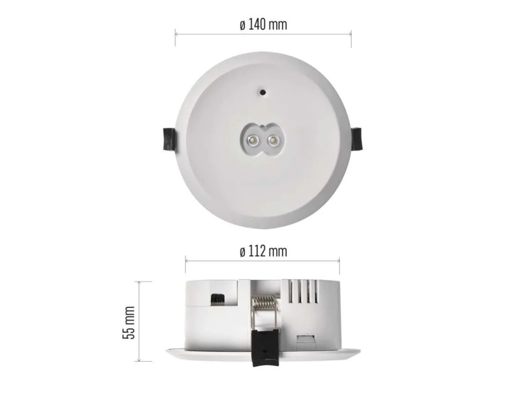 farba svetla: studená biela|farba tela: biela|dĺžka zálohy: 3 h|doba nabíjania batérie: ≥ 24 hodín|frekvencia napájacieho napätia: 50/60 Hz|kapacita batérie: 1 500 mAh|kontrolné vybavenie: manuálne tlačidlo|krytie: IP20|materiál plast (PC)|napájacie napätie: 220–240 V AC|príkon na vstupe: 3 W|predajný obal: 1 ks, krabica|prevádzkový režim: pohotovostný|rozmer: priemer 140 × 55 mm|rozsah pracovných teplôt: 0 °C až +45 °C|stupeň ochrany proti mechanickým nárazom: lm|teplota chromatickosti: 6 500 K|trieda ochrany: II|typ batérie: LiFePo4|typ montáže: vstavaný|účinník: >0,5|vstupný prúd: 27 mA|výstupné napätie: neuvádza sa|výstupné napätie v núdzovom režime: neuvádza sa|výstupný výkon roky|záruka na batériu: 2 roky|zdroj svetla: LEDDodatočné parametre