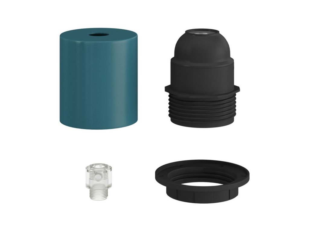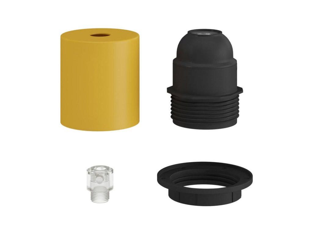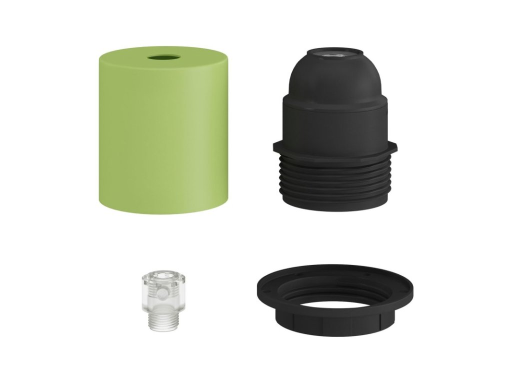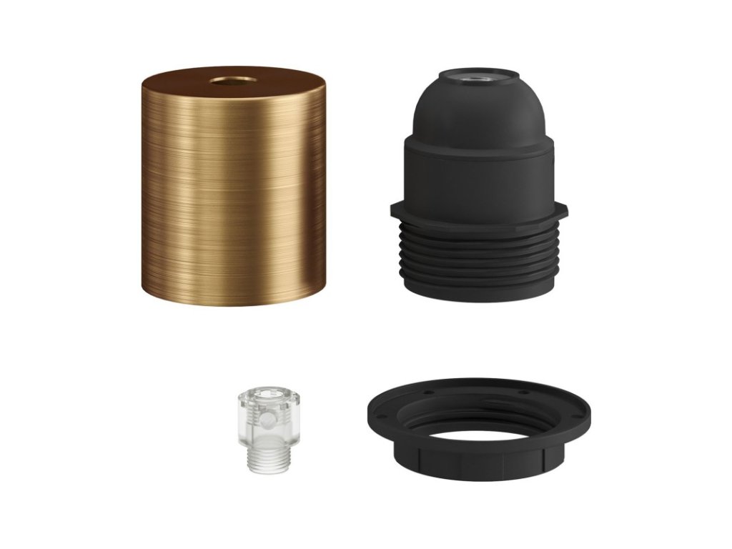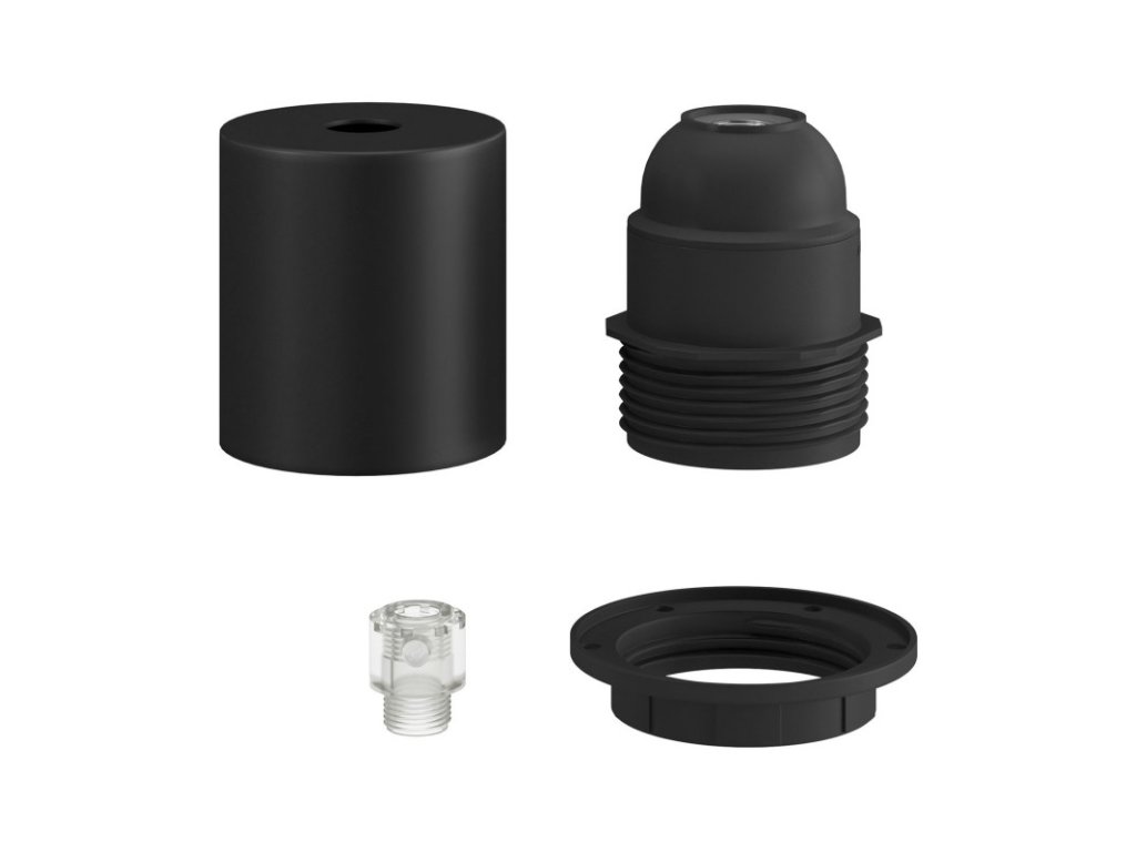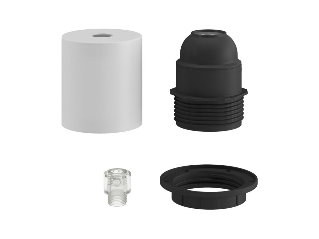 Objímka z termoplastu E27 s polovičným závitom, v sade s kovovou krytkou, slúži na zostavenie nástenného, stolného alebo stropného svietidla s tienidlom. Zostava obsahuje objímku E27 so skráteným závitom s krúžkami pre tienidlo. Kovová krytka a skrytá káblová priechodka ponúkajú ešte elegantnejšie svetelné inštalácie.