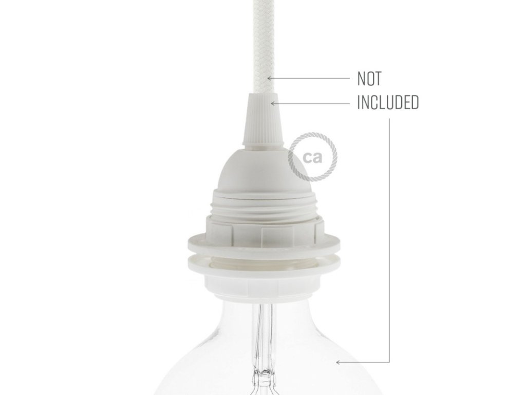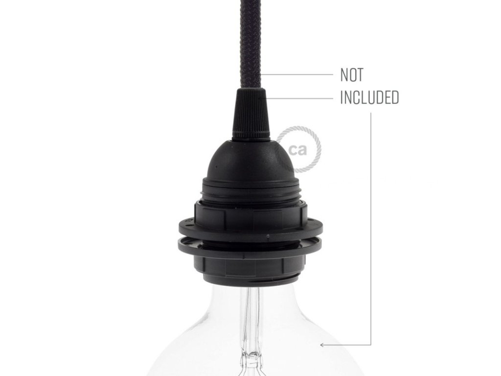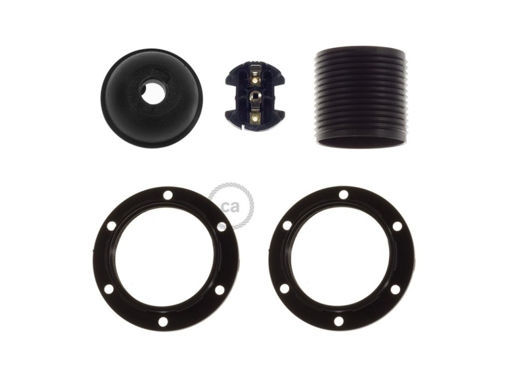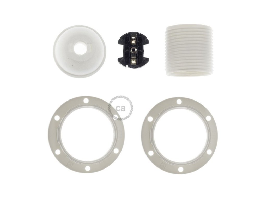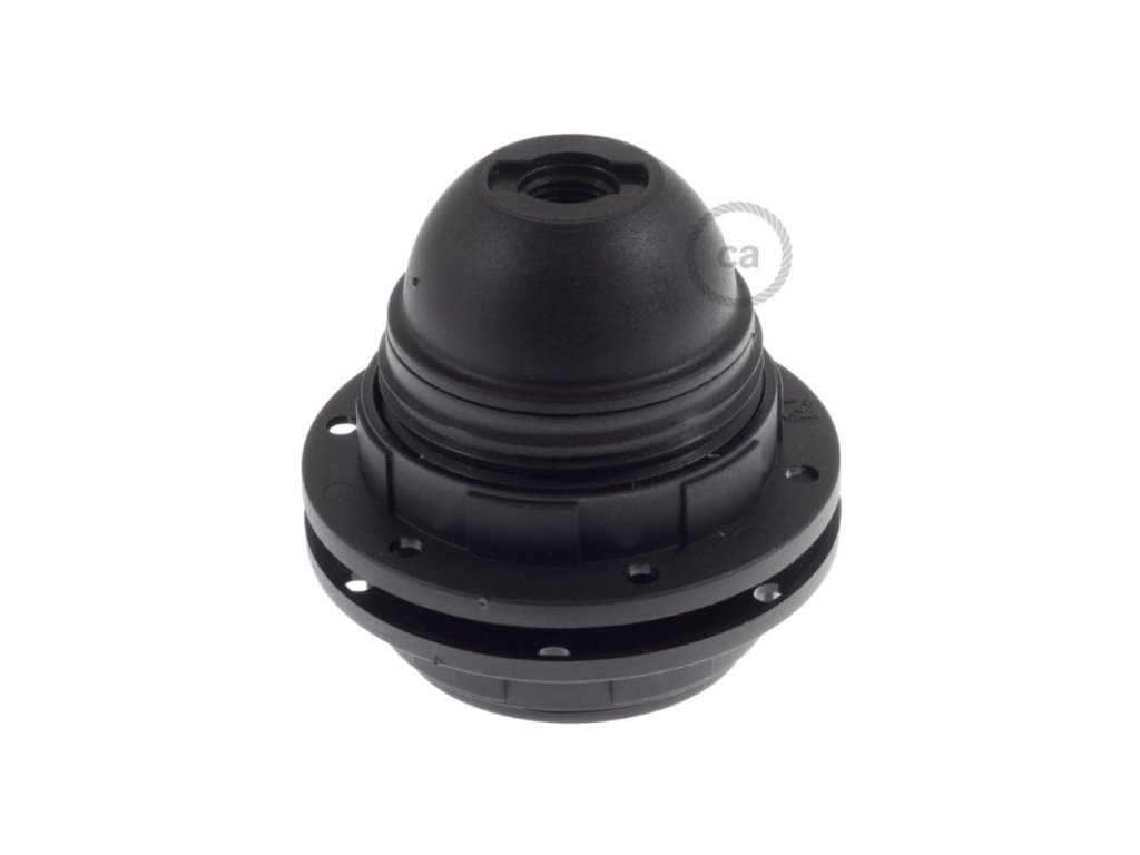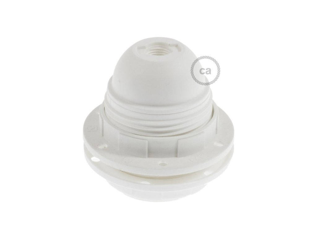 Objímka z termoplastu E27 s dvoma krúžkami pre tienidlo je užitočná pre zostavenie nástennej, stolnej alebo stropnej lampy, ktorú môžete doplniť o tienidlo. Termoplast je ľahší ako bakelit a má matný povrch.