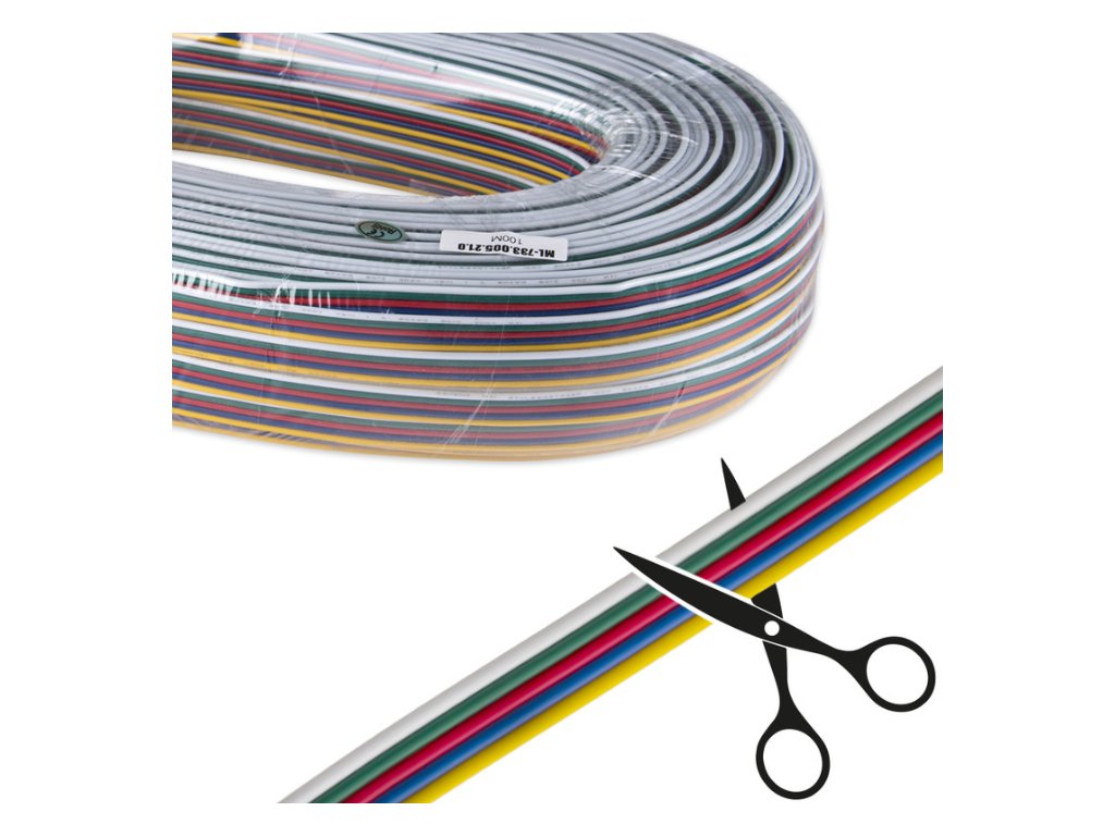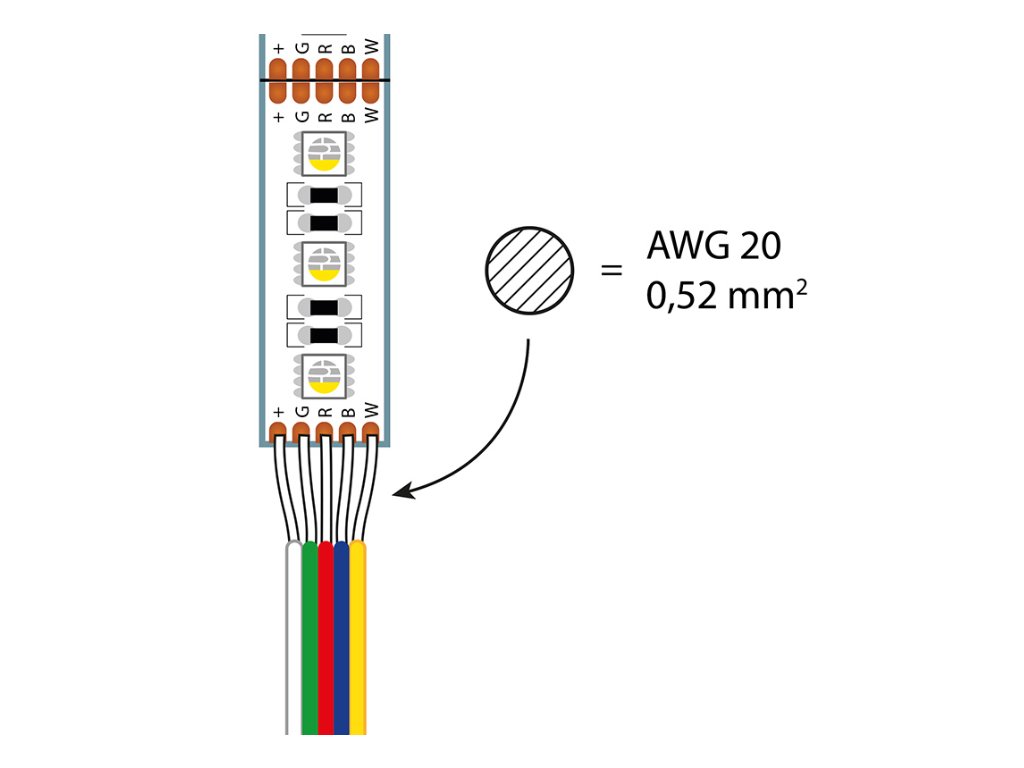 5-žilový kábel od McLED s vodičmi AWG 20. Kábel obsahuje päť medených vodičov - červený, zelený, modrý, biely a žltý s prierezom 0,5 mm². Používa sa na pripájanie a prepájanie RGB+W a RGB+WW LED pásikov. Pri zapojení voľte maximálnu dĺžku a vhodný prierez vodiča vždy s ohľadom na prípustný úbytok napätia, ktorý na vodiči vzniká priechodom prúdu.