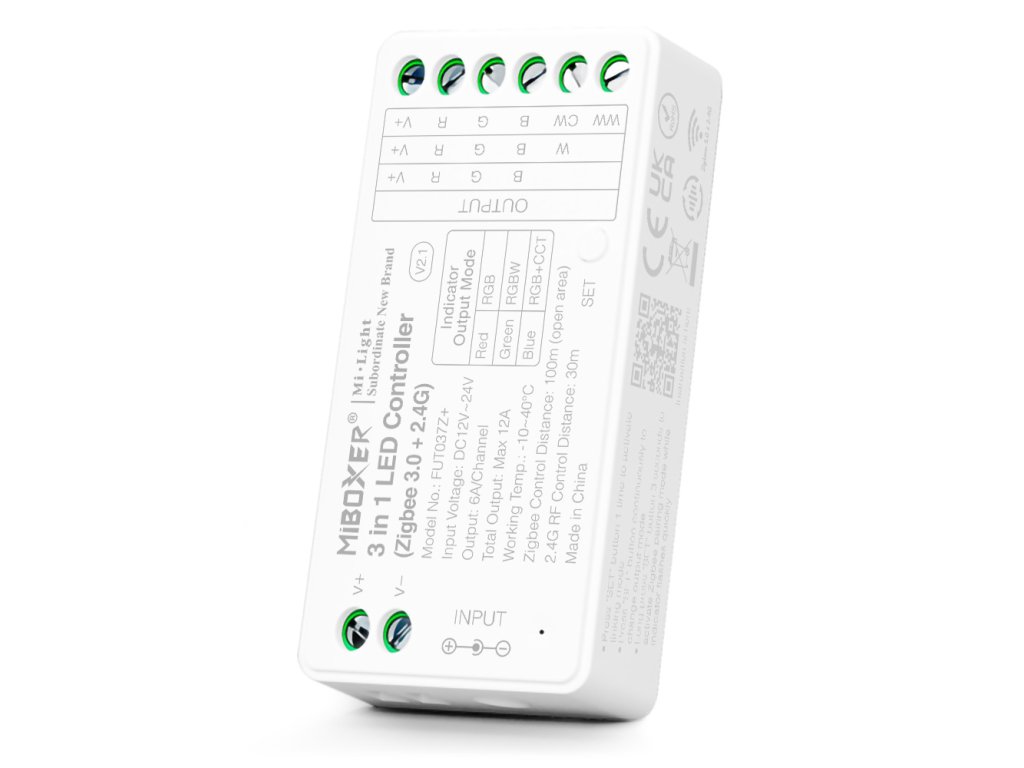 FUT037Z+ je veľmi výkonný prijímač, ktorý kombinuje tri verzie prijímačov FUT037Z, FUT038Z a FUT039Z a vďaka tomu dokáže pracovať ako s RGB tak aj s RGBW a RGB+CCT LED pásikmi.