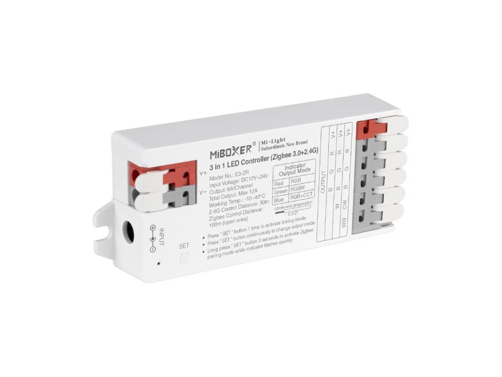 Univerzálna riadiaca jednotka 3v1 Mi-Light ZigBee 3.0 E3-ZR s páčkovou svorkovnicou umožňuje ovládanie RGB, RGBW a RGB-CCT pásikov 12V-24V s maximálnym prúdom 12A/144W alebo 288W.