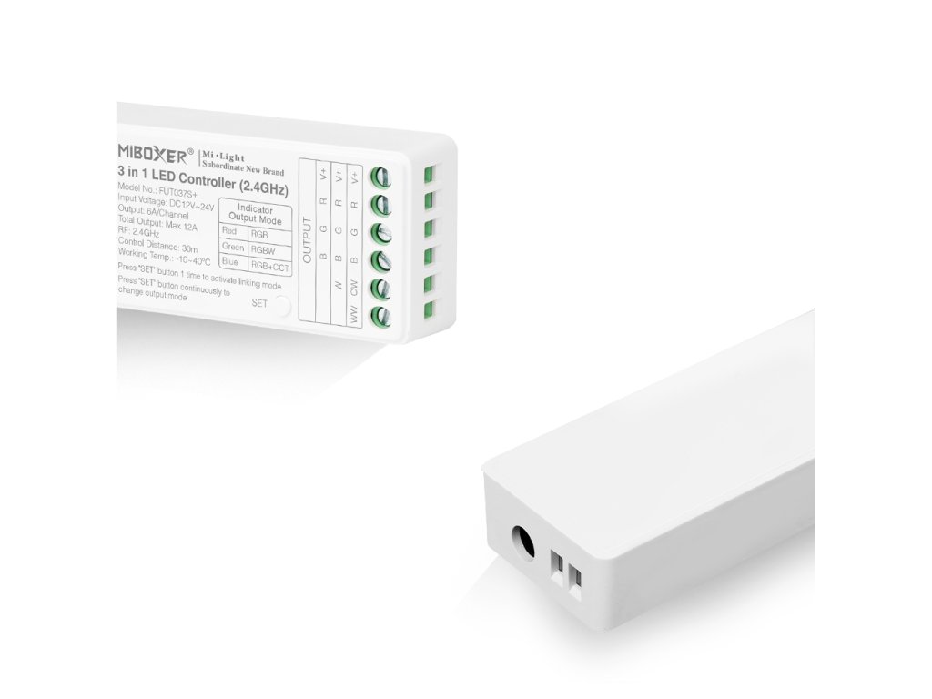 FUT037S+ je veľmi výkonný prijímač, ktorý kombinuje tri verzie prijímačov FUT037S, FUT038S a FUT039S a vďaka tomu dokáže pracovať ako s RGB tak aj s RGBW a RGB+CCT LED pásikmi.