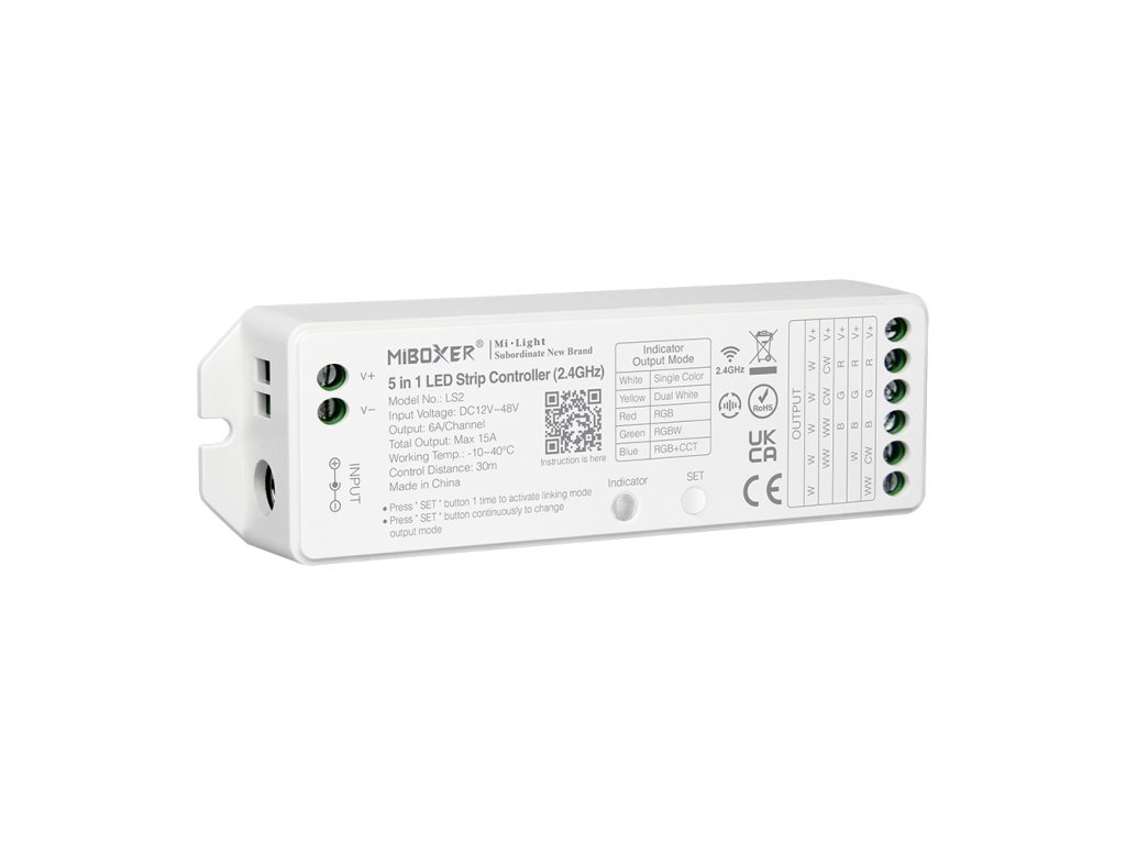 Tento prijímač ponúka celkom 5 režimov: jednofarebné LED pásky, CCT LED pásky, RGB pásky, RGBW pásky a RGBW + CCT pásky.