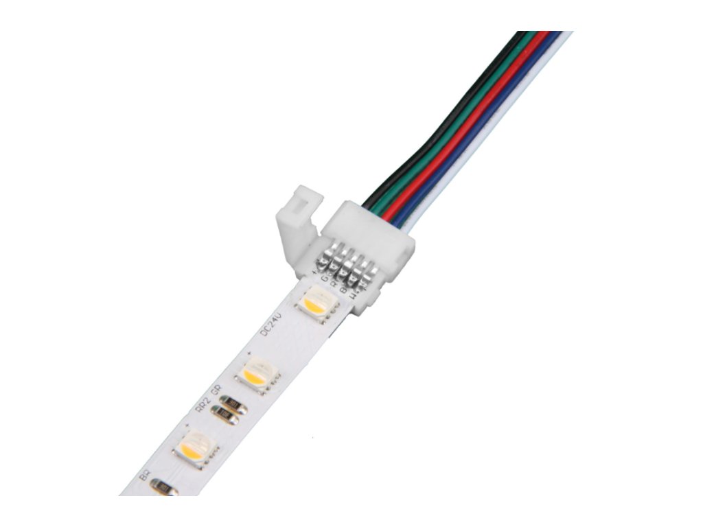 Spojka je vhodná pre domáce použitie, pre profesionálne a dlhodobé inštalácie odporúčame LED pásky spájkovať. Prípojka s konektorom a káblom pre RGBW LED pásik 10 mm.
