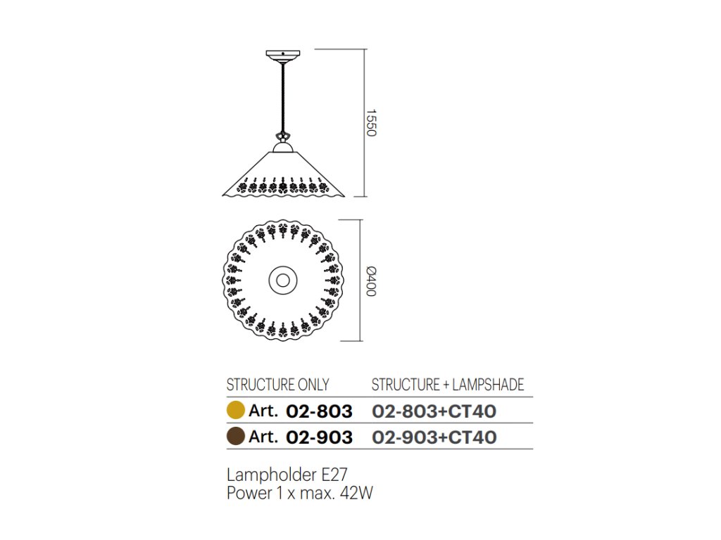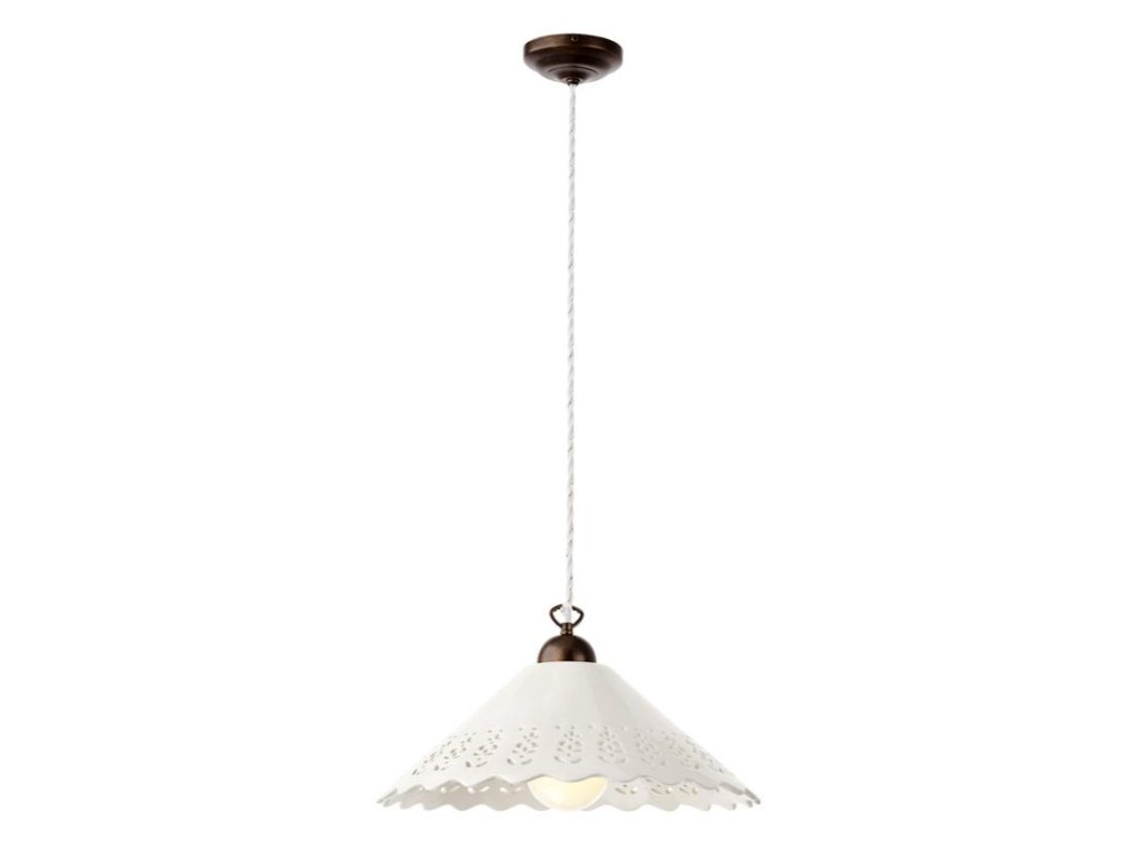 Rustikálne závesné svietidlo LEA je vhodné ako osvetlenie do horských chát, hotelov či reštaurácií. Tienidlo z bielej keramiky s priemerom 40cm, je zdobené kvetinovým vzorom. Okraje tienidla sú zaoblené. Svetlo svieti smerom dole a cez otvory vytvára zaujímavé svetelné efekty.  Zaujímavým prvkom je tiež záves s textilným káblom. Do svietidla je určená 1 žiarovka s päticou E27. V sérii Lea nejdete rôzne druhy svietidiel s podobným dizajnom na vytvorenie dokonale zjednoteného interiéru.