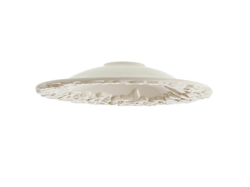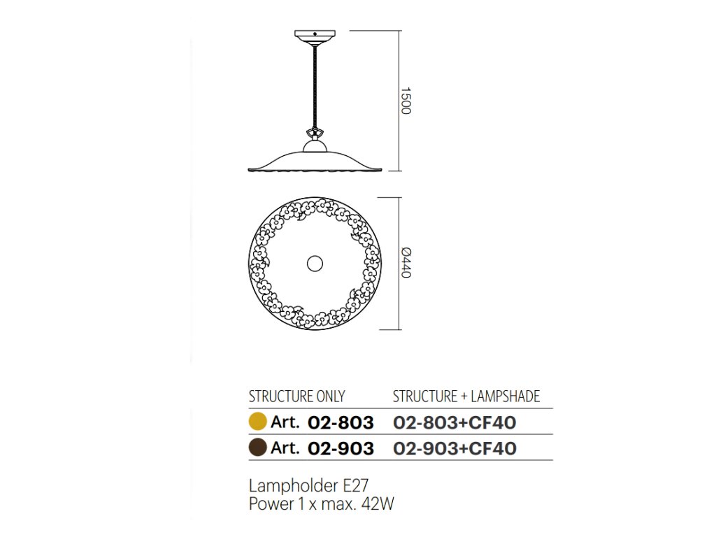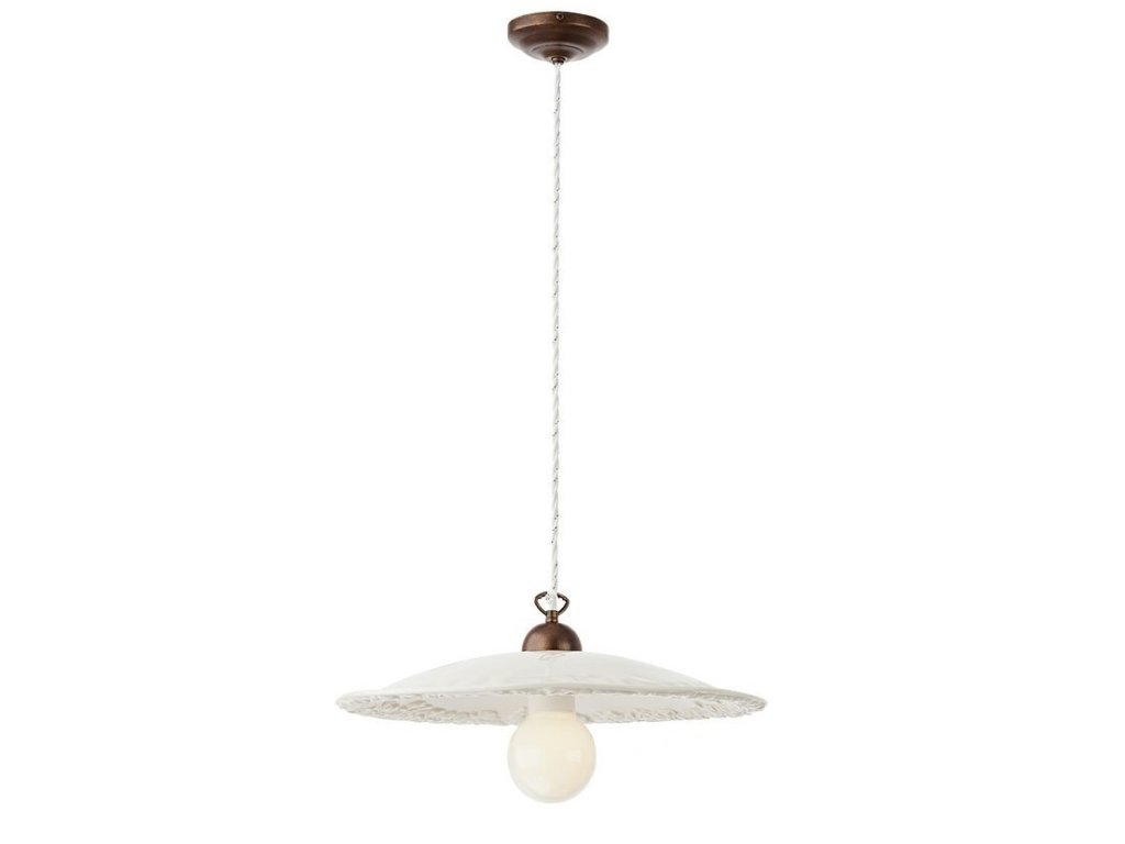 Rustikálne závesné svietidlo  LEA je vhodné ako osvetlenie do horských chát, hotelov či reštaurácií. Tienidlo z bielej keramiky s priemerom 44 cm, je zdobené kvetinovým vzorom. Okraje tienidla sú zaoblené. Svetlo svieti smerom dole. Zaujímavým prvkom je nastaviteľný záves s textilným káblom. Do svietidla je určená 1 žiarovka s päticou E27. V sérii Lea nejdete rôzne druhy svietidiel s podobným dizajnom na vytvorenie dokonale zjednoteného interiéru.