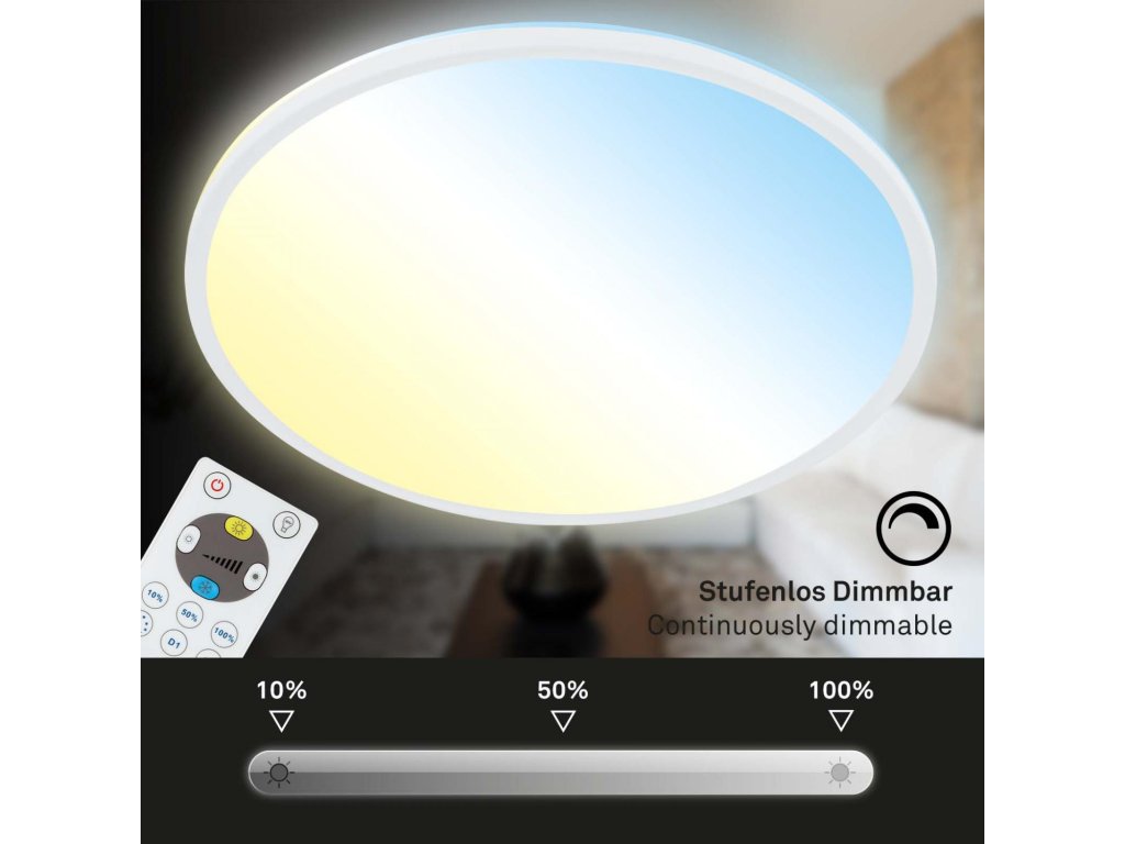 Ploché LED stropné svietidlo CCT Slim je ideálnym doplnkom do každého interiéru, vďaka svojmu jednoduchému designu. Svietidlo je ponúkané v čiernej alebo bielej farbe. Integrovaný LED modul vydáva príjemné neoslňujúce svetlo. Nastavenie teploty farieb sa vykonáva pomocou diaľkového ovládača. Diaľkovým ovládačom je možné ovládať jednotlivé svetlá a skupiny svetiel. Môžete tiež meniť ich jas a farbu a ukladať ich pomocou funkcie pamäte. Svietidlo je ultraploché, jeho výška je iba 2,5 cm. Svietidlo je vhodné ako svetlenie obývacej izby, detskej izby, alebo aj hotelovej izby.