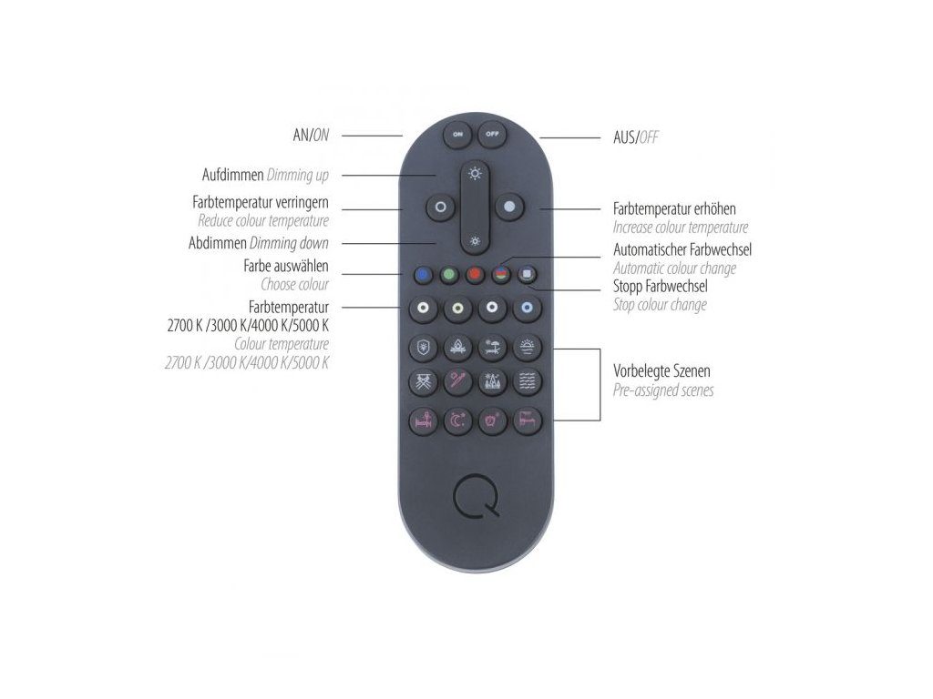 JednoduchéLED stropné svietidlo Q-KIARA je ideálnym doplnkom do každého interiéru, vďaka svojmu jednoduchému designu. Svietidlo je ponúkané v šedej alebo bielej farbe. Integrovaný LED modul vydáva príjemné neoslňujúce svetlo. Diaľkový ovládač umožňuje nastavenie teploty farieb od teplej bielej - 2700K až po dennú bielu - 5000K. Diaľkovým ovládačom môžete ovládať jednotlivé svetlá a skupiny svetiel. Ďalej môžete meniť ich jas a farbu a ukladať ich pomocou funkcie pamäte. Svietidlo O-Kiara je možné jednoducho integrovať do existujúcich systémov inteligentnej domácnosti, ktoré sú založené na bezdrôtovom štandarde ZigBee. Svietidlo je vhodné ako svetlenie obývacej izby, detskej izby, alebo aj hotelovej izby.