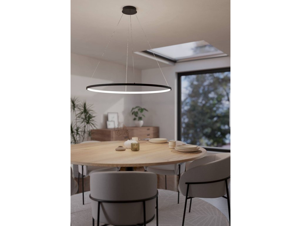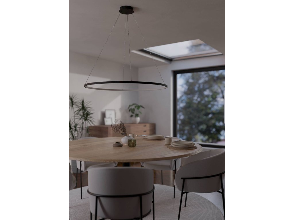 Závesné kruhové svietidlo Parruta s priemerom 99 cm je osadené LED svetelným zdrojom. Súčasť balenia je diaľkový ovládač, na ovládanie svietidla. Svietidlo je vhodné do obývacej izby, hotela, kaviarne alebo reštaurácie.