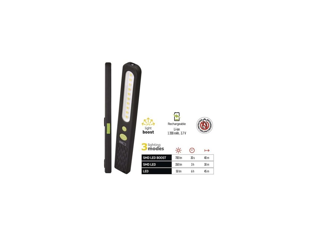 farba: zeleno-čierna|batéria súčasťou balenia: áno|doba nabíjania: 2 h|doba svietenia: 3–6 h|doba svietenia detail: SMD LED BOOST – 30 sekúnd, SMD LED 100 % – 3 h, LED 100 % – 6 h | dosvit: SMD LED BOOST – 40 m 100% – 45 m|fokus: ne|hmotnosť: 100 g|LED indikácia nabíjania: áno|LED indikácia stavu akumulátora: áno|materiál: ABS plast + guma|maximálny dosvit: 45 m|maximálny svetelný tok: 700 lm|nabíjanie: Áno|na| svietenie: 3|príslušenstvo: USB kábel|predajný obal: 1 ks, krabica|režimy svietenia: SMD LED BOOST, SMD LED 100%, LED 100%|rozmer: 37 × 14 × 240 mm|špeciálne funkcie: funkcia ochrany batérie, funkcia light BOOST|svetelný 100% – 350 lm, LED 100% – 50 lm|typ batérie: 1 200 mAh/3,7 V|typ napájacieho konektora: USB C|vodeodolnosť: ne|vybavenie: 2× magnet|záručná doba: 2 roky|zdroj svetla: SMD LED + LEDDodatočné parametre
